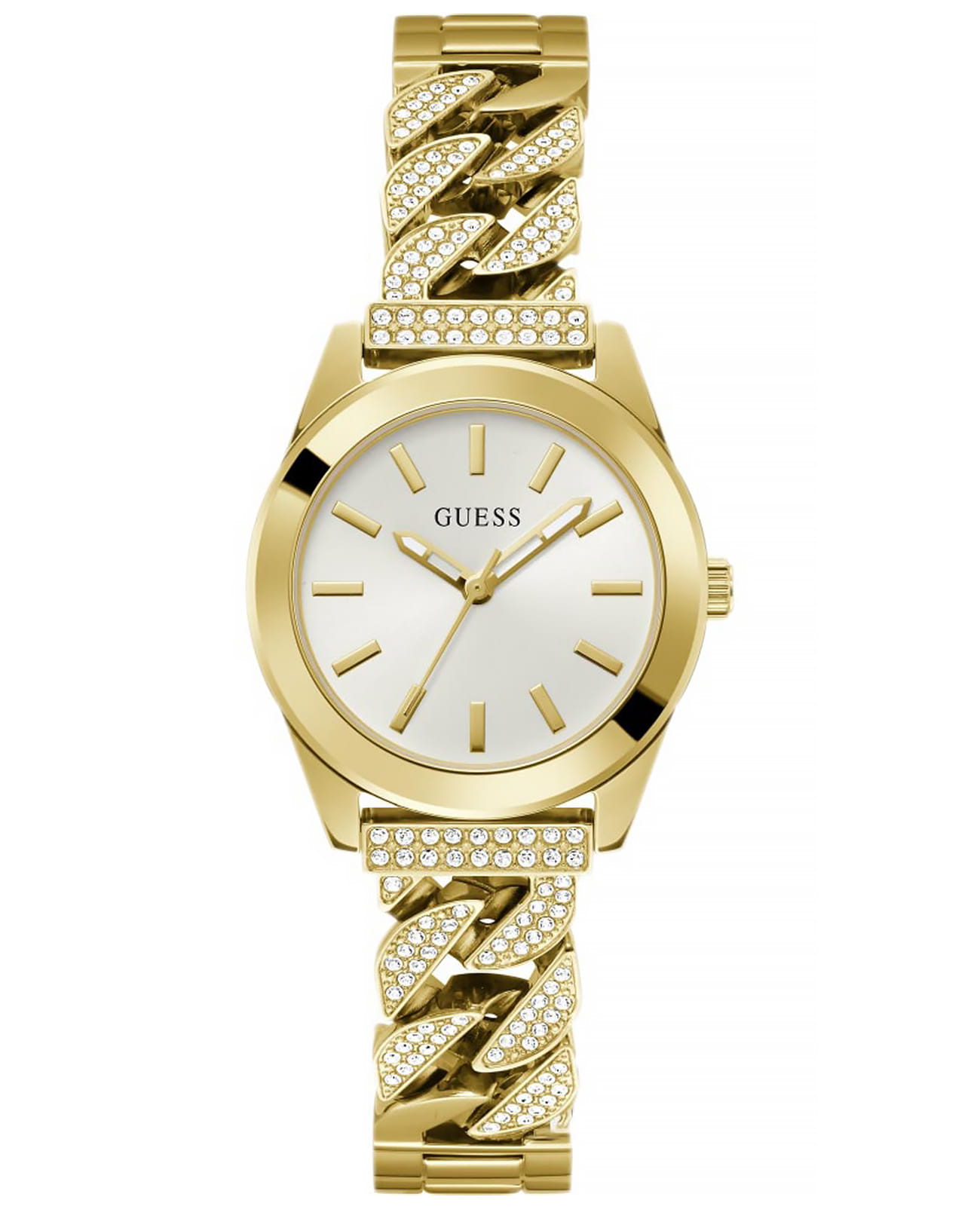 Мужские наручные часы Guess Trend GW0546L2 с минеральным стекломМинеральное стеклоМинеральное стекло представляет собой искусственно выращенный минерал кварца. Такое стекло отличается особой устойчивостью к повреждениям и царапинам. Уступает по некоторым качествам сапфировому стеклу., кварцевый механизм с высокой точностью. Класс водозащиты: 30 метров, позволит защитить корпус от случайных брызг или капель дождя. Стрелки с люминесцентным покрытиемЛюминесцентное покрытиеПозволяет считывать показания времени в темноте. Производители наносят на стрелки, часовые индексы, безель или поверхность циферблата светонакопительный состав, дающий холодное свечение.. Корпус часов и браслет изготовлены из стали с IP-покрытиемIP-покрытиеМетод ионного напыления. Демонстрирует повышенную устойчивость к истиранию, окислению и химическим веществам. Под воздействием высокого давления и температуры около 1500°C молекулы металла надёжно соединяются с частицами корпуса часов.. Браслет с ювелирной застежкой и украшен кристаллами.