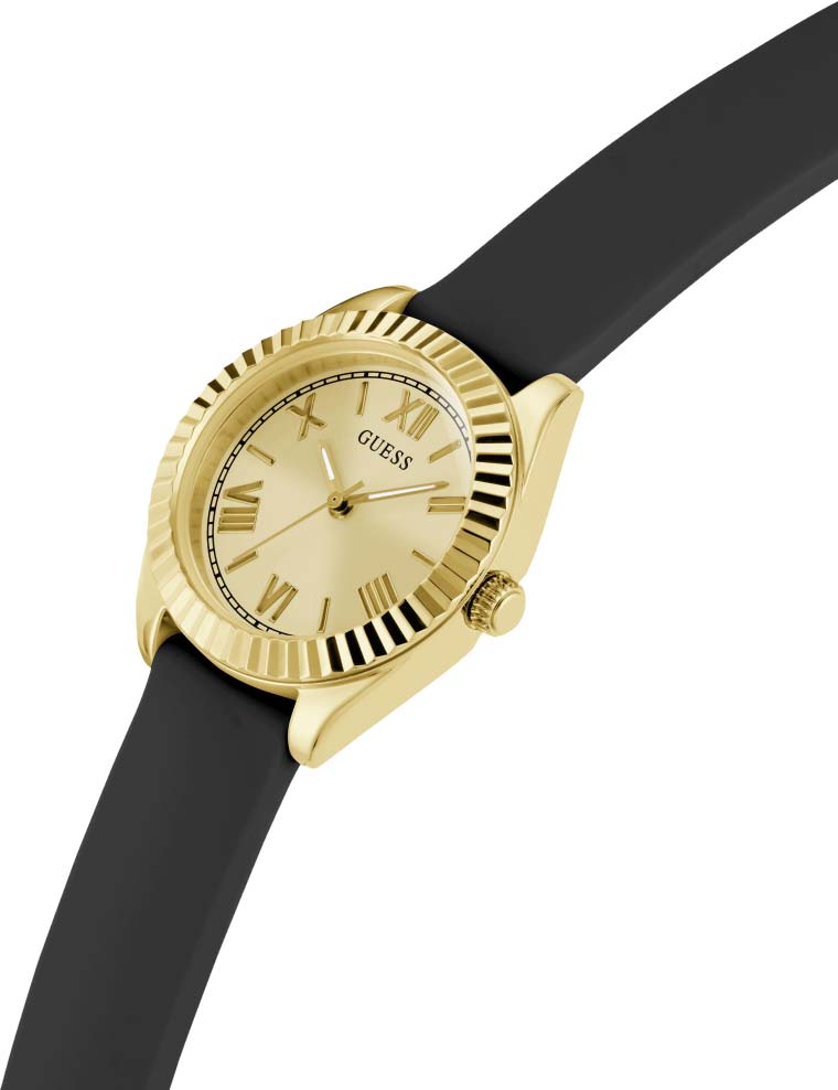 Женские наручные часы Guess Dress GW0724L2 с минеральным стекломМинеральное стеклоМинеральное стекло представляет собой искусственно выращенный минерал кварца. Такое стекло отличается особой устойчивостью к повреждениям и царапинам. Уступает по некоторым качествам сапфировому стеклу., кварцевый механизм с высокой точностью. Класс водозащиты: 30 метров, позволит защитить корпус от случайных брызг или капель дождя. Корпус часов изготовлен из стали с IP-покрытиемIP-покрытиеМетод ионного напыления. Демонстрирует повышенную устойчивость к истиранию, окислению и химическим веществам. Под воздействием высокого давления и температуры около 1500°C молекулы металла надёжно соединяются с частицами корпуса часов.. Силиконовый ремешок. Стрелки с люминесцентным покрытиемЛюминесцентное покрытиеПозволяет считывать показания времени в темноте. Производители наносят на стрелки, часовые индексы, безель или поверхность циферблата светонакопительный состав, дающий холодное свечение..