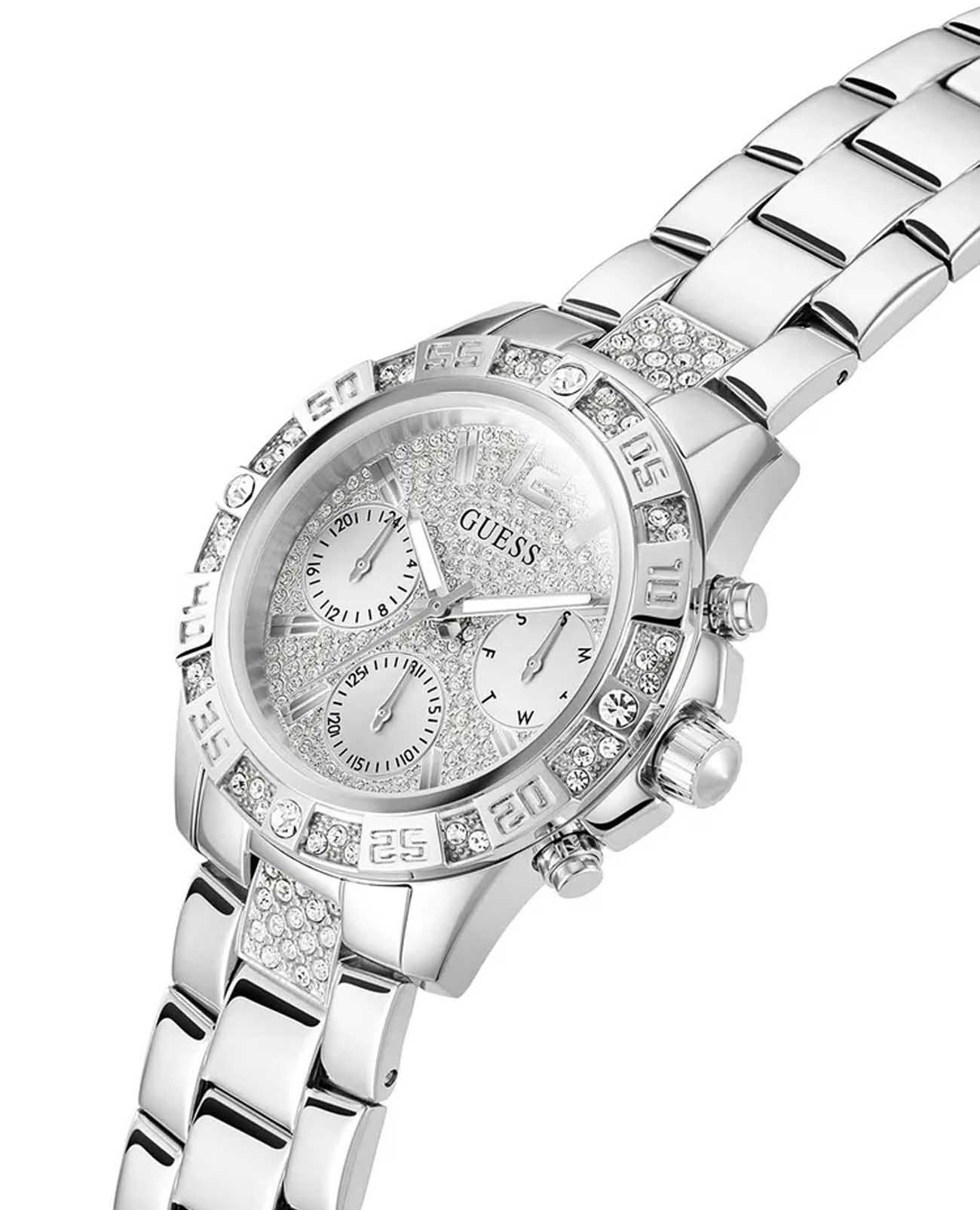 Женские наручные часы Guess Dress GW0771L1 с минеральным стекломМинеральное стеклоМинеральное стекло представляет собой искусственно выращенный минерал кварца. Такое стекло отличается особой устойчивостью к повреждениям и царапинам. Уступает по некоторым качествам сапфировому стеклу., кварцевый механизм с высокой точностью. Корпус часов изготовлен из стали. БезельБезельВнешний ободок, закрепляющий стекло. В спортивных часах так называется поворотное кольцо с делениями на циферблате, выполняет роль таймера – замеряет отрезки времени на шкале. Неподвижный безель – элемент декора. Однонаправленно вращающийся безель на дайверских часах позволяет фиксировать моменты погружения и выныривания на поверхность. украшен кристаллами. Стрелки с люминесцентным покрытиемЛюминесцентное покрытиеПозволяет считывать показания времени в темноте. Производители наносят на стрелки, часовые индексы, безель или поверхность циферблата светонакопительный состав, дающий холодное свечение.. Класс водозащиты: 50 метров, позволит защитить корпус от случайных брызг или капель дождя. Стальной браслет на раскладной застёжкеРаскладная застёжкаТакой тип застёжки используется только на браслетах из металла. Она никогда не раскрывается полностью, происходит разделение на 2 и более частей. Раскладывающая застёжка снизит вероятность потери часов к минимуму..