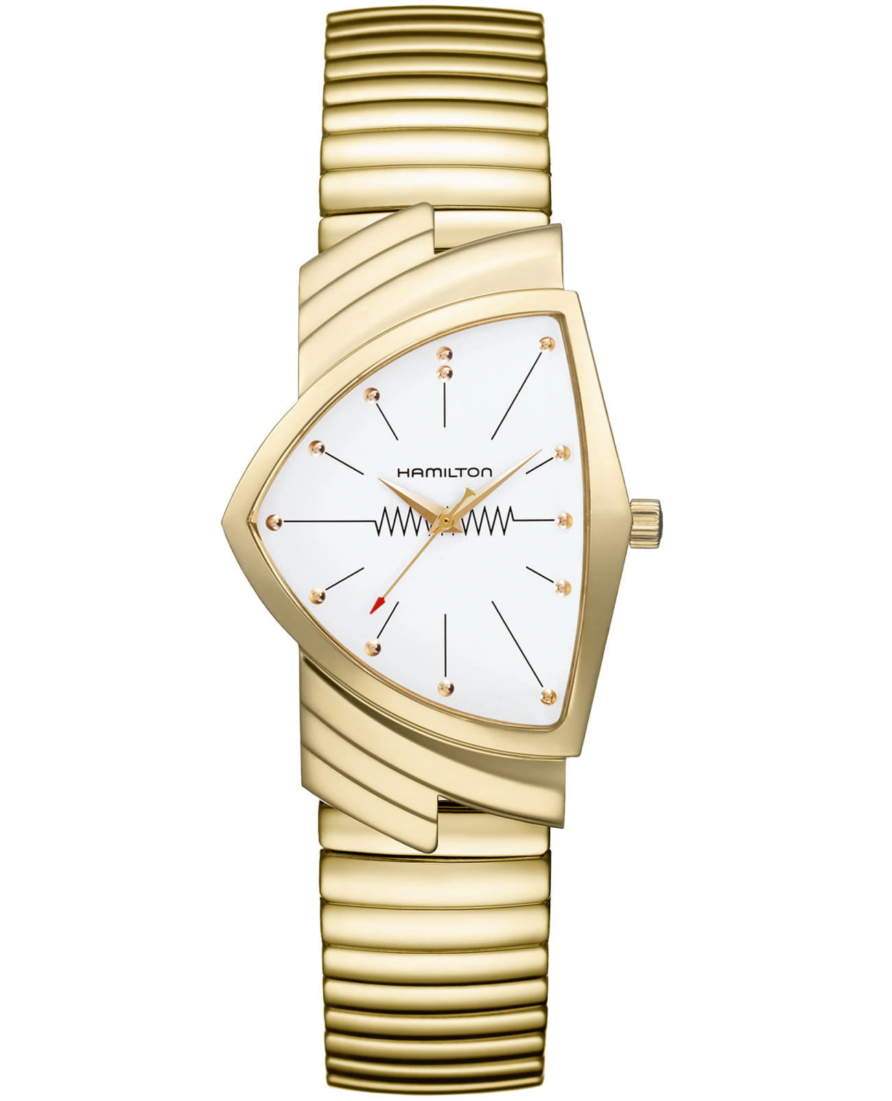 Часы Hamilton Ventura Quart H24301111, кварцевый механизм F05.111 с высокой точностью. Корпус часов изготовлен из нержавеющей стали с PVD-покрытием желтого цвета. Стекло циферблата минеральное. Водостойкость - 50 м. Браслет из нержавеющей стали с раскладывающейся застежкой.
