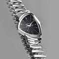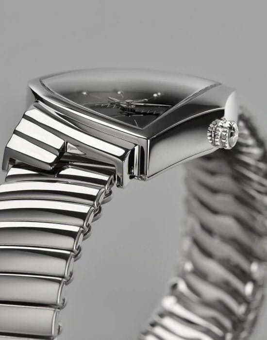 Модель Hamilton Ventura Quartz H24411232 — культовые часы с неподражаемым треугольным корпусом из нержавеющей стали, сохранившие свой бунтарский дух спустя более 60 лет. Черный циферблат украшен серебристым зигзагообразным узором, символизирующим электрический импульс, а серебристые стрелки и часовые метки создают стильный контраст. Минеральное стеклоМинеральное стеклоМинеральное стекло представляет собой искусственно выращенный минерал кварца. Такое стекло отличается особой устойчивостью к повреждениям и царапинам. Уступает по некоторым качествам сапфировому стеклу. защищает дисплей от повреждений, сохраняя идеальный внешний вид. Часы оснащены точным кварцевым механизмом калибра F05.111, обеспечивающим надежность работы. Браслет из нержавеющей стали гарантирует удобство и комфорт при ношении. Водонепроницаемость до 50 метров защищает механизм от случайных брызг и дождя. Hamilton Ventura H24411232 — смелый выбор для тех, кто ценит оригинальный дизайн и легендарную историю.