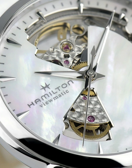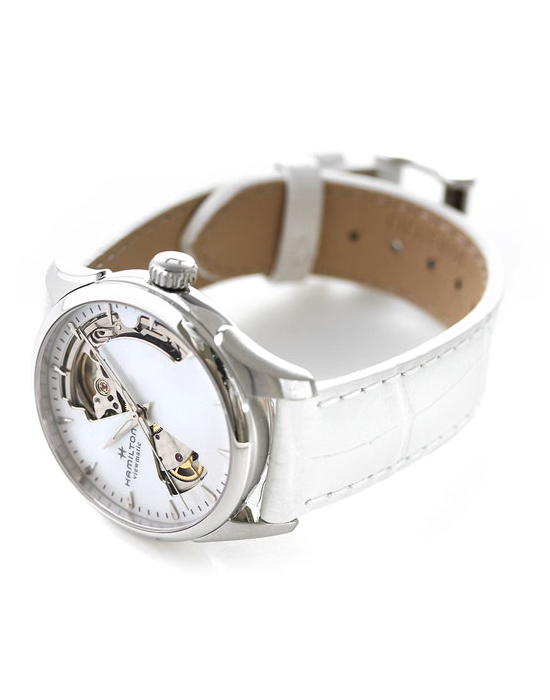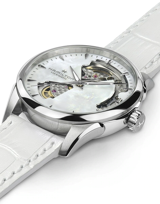 Женские механические швейцарские часы Hamilton Jazzmaster Open Heart Lady Auto H32215890, автоматический механизм с высокой точностью. Сапфировое стеклоСапфировое стеклоПрочный и надёжный материал из кристалла сапфира синтетического происхождения, характеризующийся особой твёрдостью и устойчивостью к царапинам и повреждениям. устойчивое к появлению царапин, обладающее высокой прозрачностью. Класс водозащиты: 50 метров, позволит защитить корпус от случайных брызг или капель дождя. Корпус часов изготовлен из нержавеющей стали. Стрелки с люминесцентным покрытиемЛюминесцентное покрытиеПозволяет считывать показания времени в темноте. Производители наносят на стрелки, часовые индексы, безель или поверхность циферблата светонакопительный состав, дающий холодное свечение..
