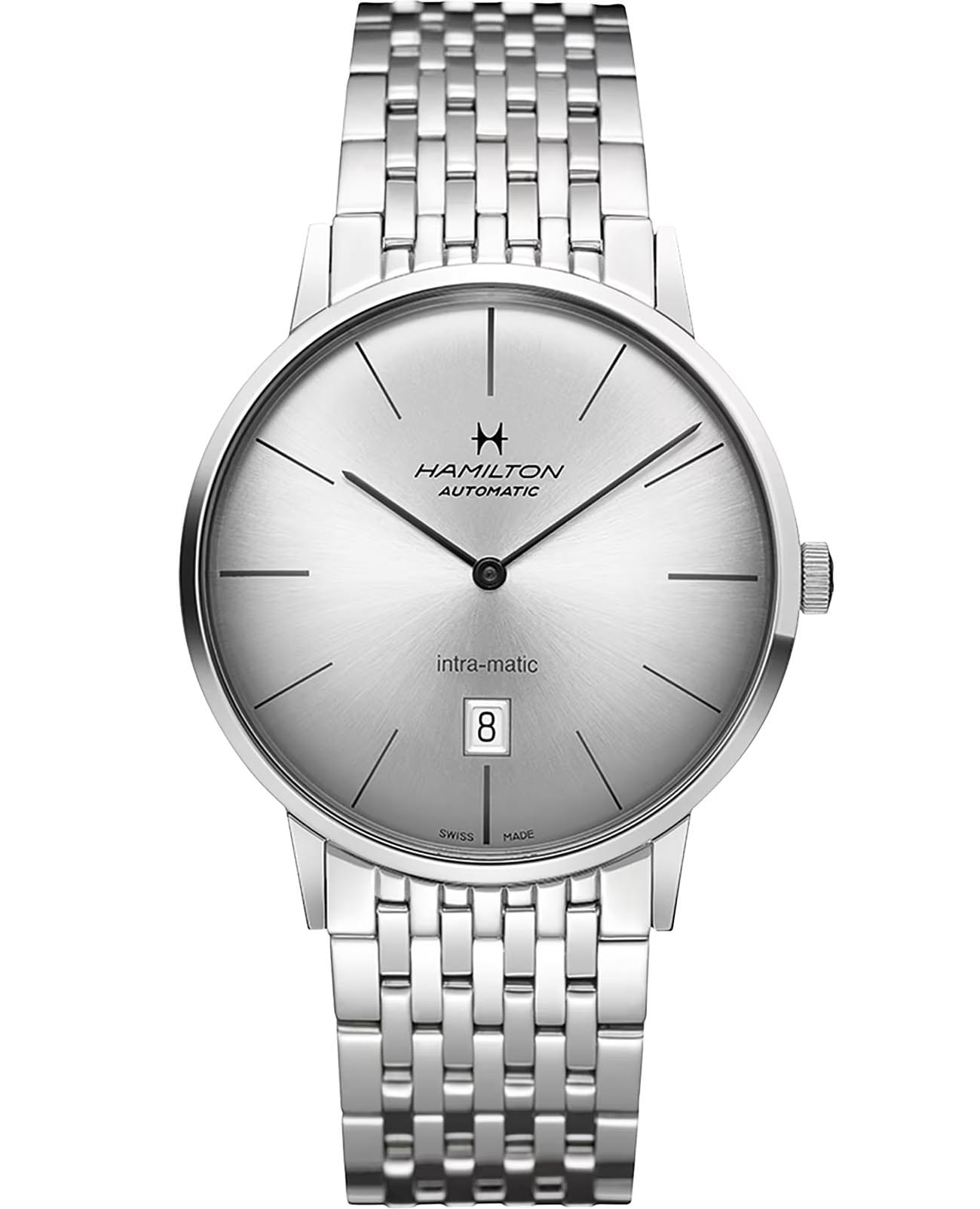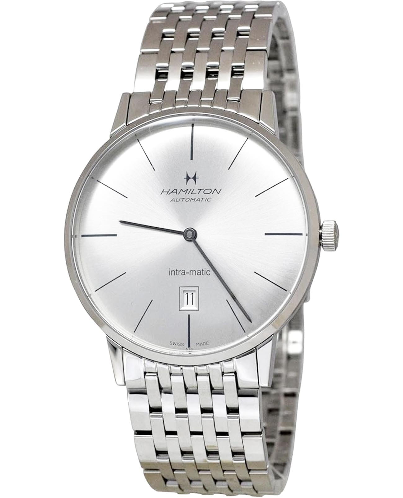 Мужские наручные часы Hamilton American Classic Intra-Matic Auto H38755151 с надёжным автоматическим механизмом. Корпус часов изготовлен из нержавеющей стали. Стальной браслет на застёжке-бабочке с кнопкамиЗастёжка "бабочка"Такой вид застёжки дополняется предохранителями, помогающими избежать случайного раскрытия браслета. Обладают изящным исполнением. . Сапфировое стеклоСапфировое стеклоПрочный и надёжный материал из кристалла сапфира синтетического происхождения, характеризующийся особой твёрдостью и устойчивостью к царапинам и повреждениям. с антибликовым покрытием. Окошко даты находится в положении 6 часов. Класс водозащиты: 50 метров, позволит защитить корпус от случайных брызг или капель дождя.
