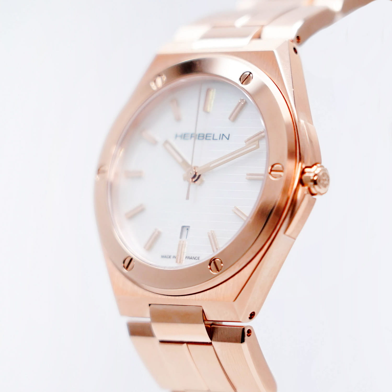 Женские кварцевые часы Herbelin Cap Camarat 14545BPR19 – отражающий идеальное сочетание современного дизайна, надёжности и функциональности. Элегантный облик станет превосходным завершением образа, наделив его индивидуальным характером. Корпус из нержавеющей стали с PVD-покрытиемPVDУльтратонкое покрытие наносится в технике вакуумного напыления, сочетает в себе нитрид титана особой прочности со слоем золота или оксида хрома. Несёт в себе декоративную или защитную функцию. цвета розового золота, диаметром 33 мм и толщиной 7.1 мм, идеально сбалансирован и элегантен. Сапфировое стеклоСапфировое стеклоПрочный и надёжный материал из кристалла сапфира синтетического происхождения, характеризующийся особой твёрдостью и устойчивостью к царапинам и повреждениям. защищает циферблат от царапин и устойчивое к механическим повреждениям. БезельБезельВнешний ободок, закрепляющий стекло. В спортивных часах так называется поворотное кольцо с делениями на циферблате, выполняет роль таймера – замеряет отрезки времени на шкале. Неподвижный безель – элемент декора. Однонаправленно вращающийся безель на дайверских часах позволяет фиксировать моменты погружения и выныривания на поверхность. украшен винтами, заводная головка с защитой. Окошко даты находится в положении 6 часов. Стрелки и метки с люминесцентным покрытиемЛюминесцентное покрытиеПозволяет считывать показания времени в темноте. Производители наносят на стрелки, часовые индексы, безель или поверхность циферблата светонакопительный состав, дающий холодное свечение.. Стальной браслет с PVD-покрытиемPVDУльтратонкое покрытие наносится в технике вакуумного напыления, сочетает в себе нитрид титана особой прочности со слоем золота или оксида хрома. Несёт в себе декоративную или защитную функцию. на застёжке-бабочке с кнопкамиЗастёжка "бабочка"Такой вид застёжки дополняется предохранителями, помогающими избежать случайного раскрытия браслета. Обладают изящным исполнением. обеспечивает комфортное ношение. Водозащита 100 метров позволит плавать, нырять и заниматься другими водными видами спорта. Эта модель – отличный выбор для тех, кто ищет сочетание стиля, качества и функциональности. Часы станут не только полезным аксессуаром, но и выразительным элементом вашего имиджа.