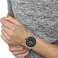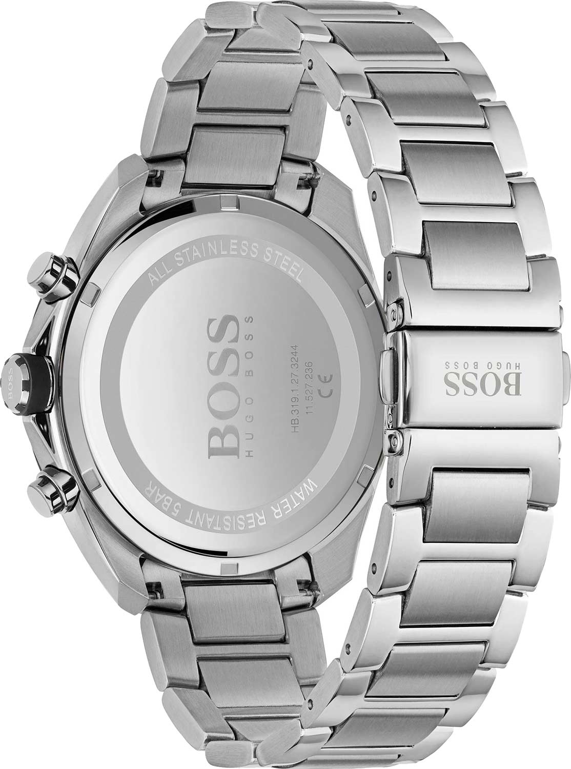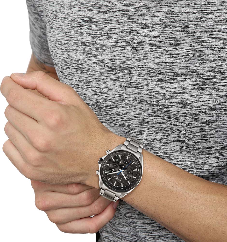 Мужские часы Hugo Boss Distinct HB1513857 представлены в круглом 46-мм корпусе из нержавеющей стали 316L с IP-покрытиемIP-покрытиеМетод ионного напыления. Демонстрирует повышенную устойчивость к истиранию, окислению и химическим веществам. Под воздействием высокого давления и температуры около 1500°C молекулы металла надёжно соединяются с частицами корпуса часов.. Оснащены кварцевым механизмом с функциями хронографаХронографФункция позволяет измерять отрезки времени с особой точностью: часы, минуты, секунды. Верным признаком хронографа является наличие на циферблате 3 дополнительных окошек-счётчиков., секундомеромСекундомерСекундоме́р — прибор, способный измерять интервалы времени с точностью до долей секунды. и тахиметрической шкалойТахиметрРазмеченная шкала, располагается на ободке или безеле часов. Тахиметр позволяет рассчитать скорость на определённом участке пути, расстояние измеряется в километрах или милях., а также индикацией даты. Черный циферблат с метками в виде штрихов защищен устойчивым к царапинам минеральным стекломМинеральное стеклоМинеральное стекло представляет собой искусственно выращенный минерал кварца. Такое стекло отличается особой устойчивостью к повреждениям и царапинам. Уступает по некоторым качествам сапфировому стеклу.. Браслет из стали 316L дополнен раскладной застёжкойРаскладная застёжкаТакой тип застёжки используется только на браслетах из металла. Она никогда не раскрывается полностью, происходит разделение на 2 и более частей. Раскладывающая застёжка снизит вероятность потери часов к минимуму.. Водонепроницаемость 50 метров (5 ATM) обеспечивает защиту от брызг и дождя.