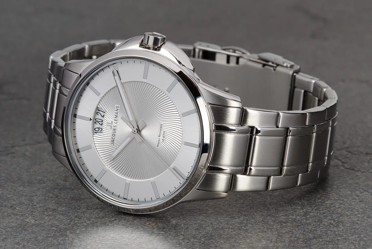 Мужские австрийские часы Jacques Lemans Classic 1-1540E, кварцевый механизм с высокой точностью. Класс водозащиты: 100 метров, позволит плавать, нырять и заниматься другими водными видами спорта. Корпус часов изготовлен из стали серебристого цвета. Заводная головка с защитой. Браслет с раскладывающейся застёжкойРаскладная застёжкаТакой тип застёжки используется только на браслетах из металла. Она никогда не раскрывается полностью, происходит разделение на 2 и более частей. Раскладывающая застёжка снизит вероятность потери часов к минимуму.. Застежка с системой блокировки.