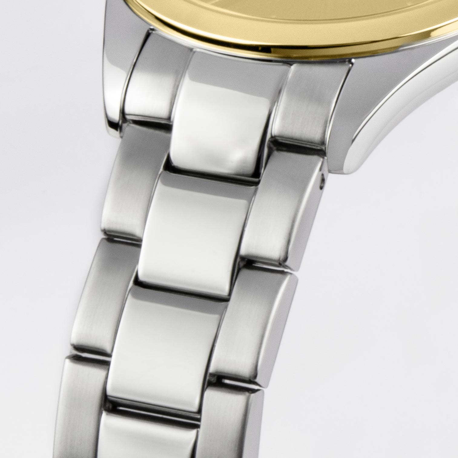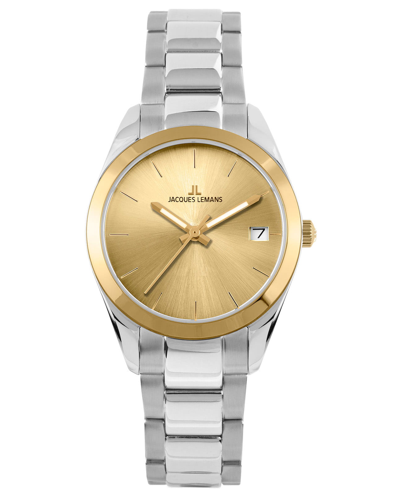 Женские часы Jacques Lemans Classic 1-1878E с минеральным стекломМинеральное стеклоМинеральное стекло представляет собой искусственно выращенный минерал кварца. Такое стекло отличается особой устойчивостью к повреждениям и царапинам. Уступает по некоторым качествам сапфировому стеклу., кварцевый механизм с высокой точностью. Корпус из нержавеющей стали. Неподвижный безельБезельВнешний ободок, закрепляющий стекло. В спортивных часах так называется поворотное кольцо с делениями на циферблате, выполняет роль таймера – замеряет отрезки времени на шкале. Неподвижный безель – элемент декора. Однонаправленно вращающийся безель на дайверских часах позволяет фиксировать моменты погружения и выныривания на поверхность. из нержавеющей стали с PVDPVDУльтратонкое покрытие наносится в технике вакуумного напыления, сочетает в себе нитрид титана особой прочности со слоем золота или оксида хрома. Несёт в себе декоративную или защитную функцию. покрытием. Стрелки с люминесцентным покрытиемЛюминесцентное покрытиеПозволяет считывать показания времени в темноте. Производители наносят на стрелки, часовые индексы, безель или поверхность циферблата светонакопительный состав, дающий холодное свечение.. Окошко даты расположено в позиции «3 часа». Класс водозащиты: 100 метров, позволит плавать, нырять и заниматься другими водными видами спорта. Браслет из нержавеющей стали на раскладной застёжкеРаскладная застёжкаТакой тип застёжки используется только на браслетах из металла. Она никогда не раскрывается полностью, происходит разделение на 2 и более частей. Раскладывающая застёжка снизит вероятность потери часов к минимуму..