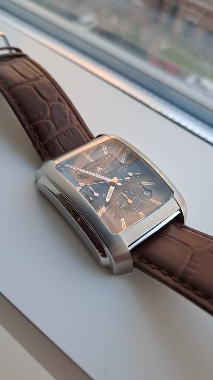 Мужские часы- хронографХронографФункция позволяет измерять отрезки времени с особой точностью: часы, минуты, секунды. Верным признаком хронографа является наличие на циферблате 3 дополнительных окошек-счётчиков. с секундомеромСекундомерСекундоме́р — прибор, способный измерять интервалы времени с точностью до долей секунды. в необычном корпусе прямоугольной формы. Кварцевый механизм с высокой точностью. Минеральное стеклоМинеральное стеклоМинеральное стекло представляет собой искусственно выращенный минерал кварца. Такое стекло отличается особой устойчивостью к повреждениям и царапинам. Уступает по некоторым качествам сапфировому стеклу. устойчивое к появлению царапин, обладающее высокой прозрачностью. Класс водозащиты: 30 метров, позволит защитить корпус от случайных брызг или капель дождя. Корпус часов изготовлен из нержавеющей стали. На циферблате расположены три дополнительных индикатора и окошко даты. Окно даты расположено между 4 и 5 часами. Стрелки и метки с люминесцентным покрытиемЛюминесцентное покрытиеПозволяет считывать показания времени в темноте. Производители наносят на стрелки, часовые индексы, безель или поверхность циферблата светонакопительный состав, дающий холодное свечение.. Ремешок из натуральной кожи на стандартной застежке.