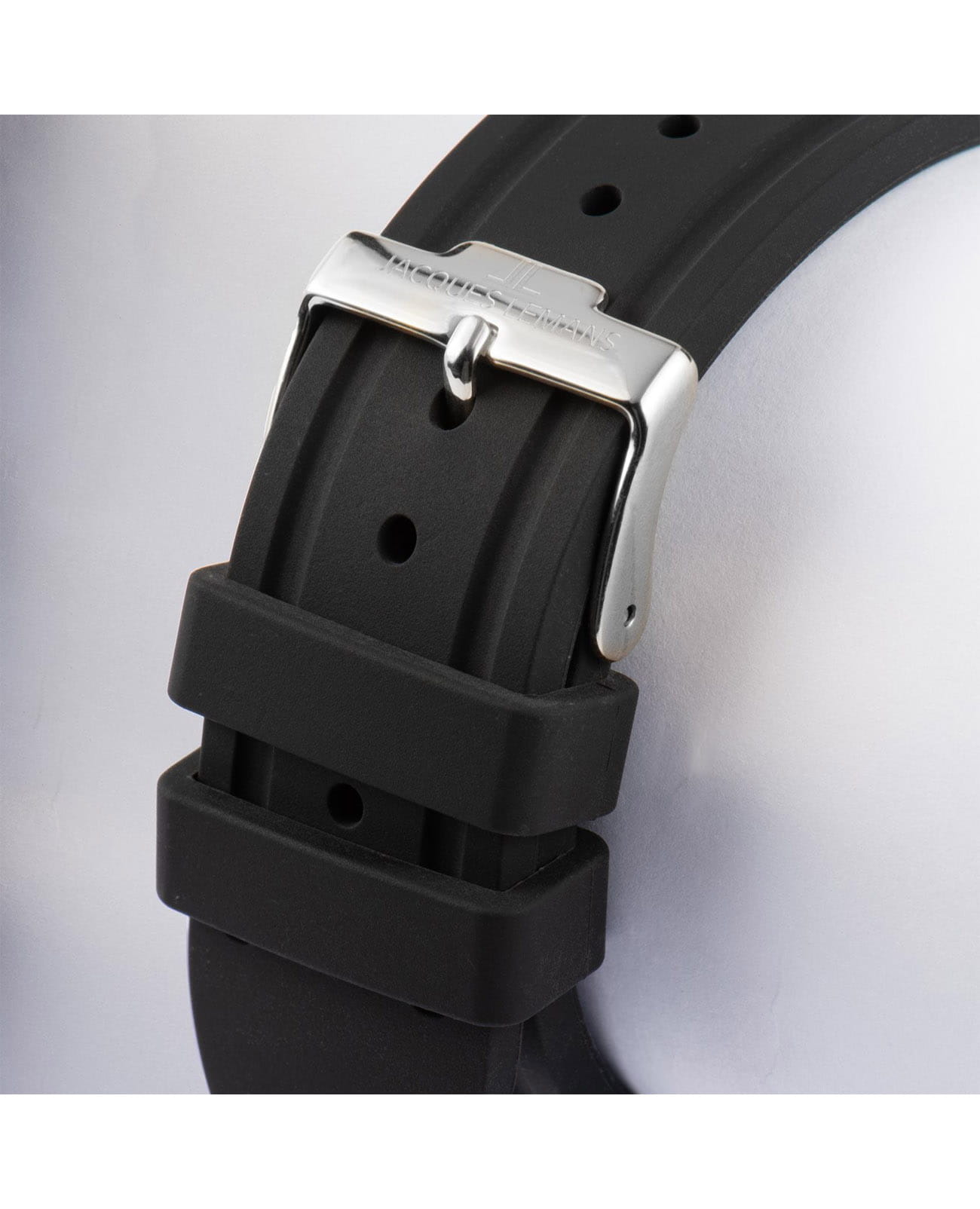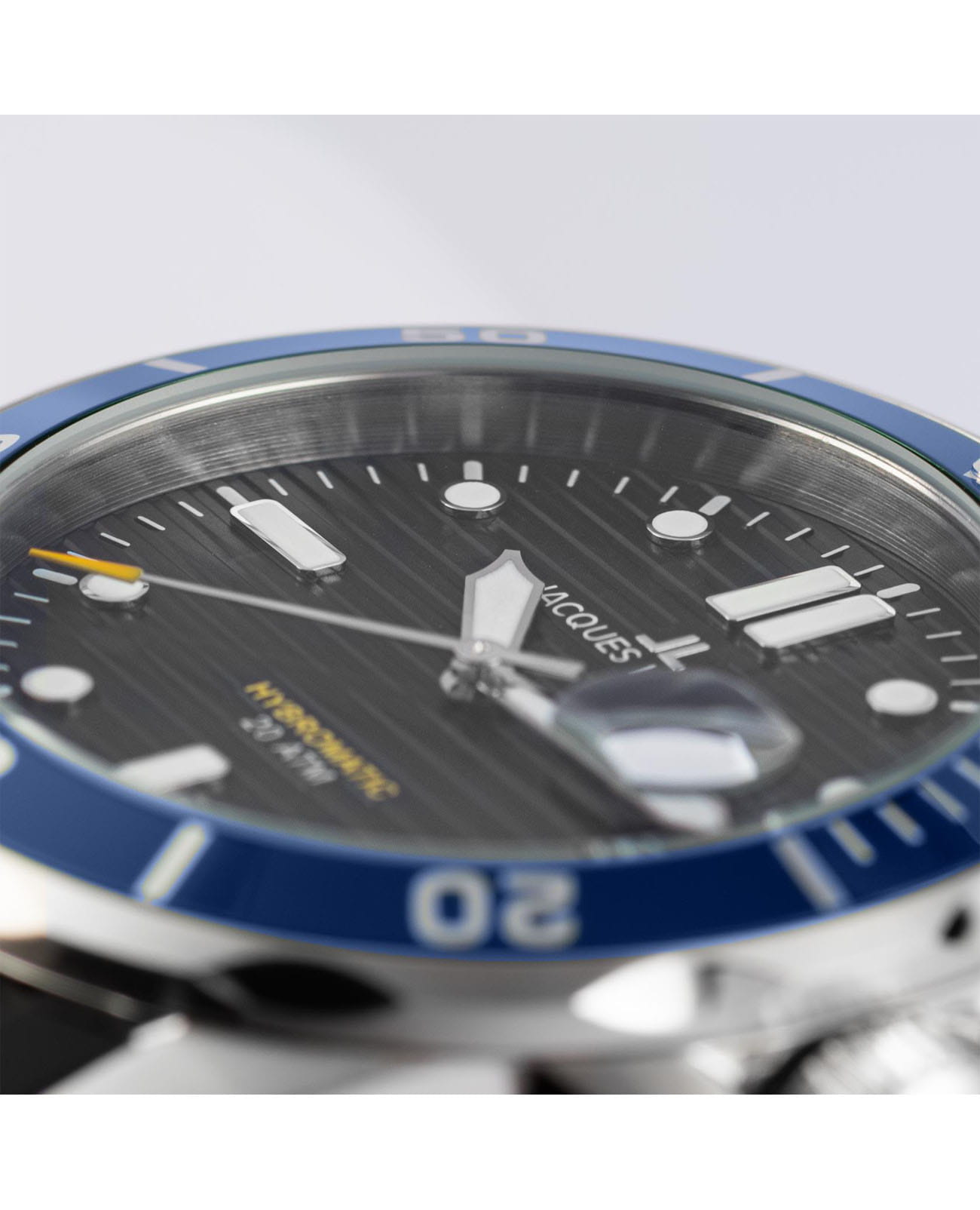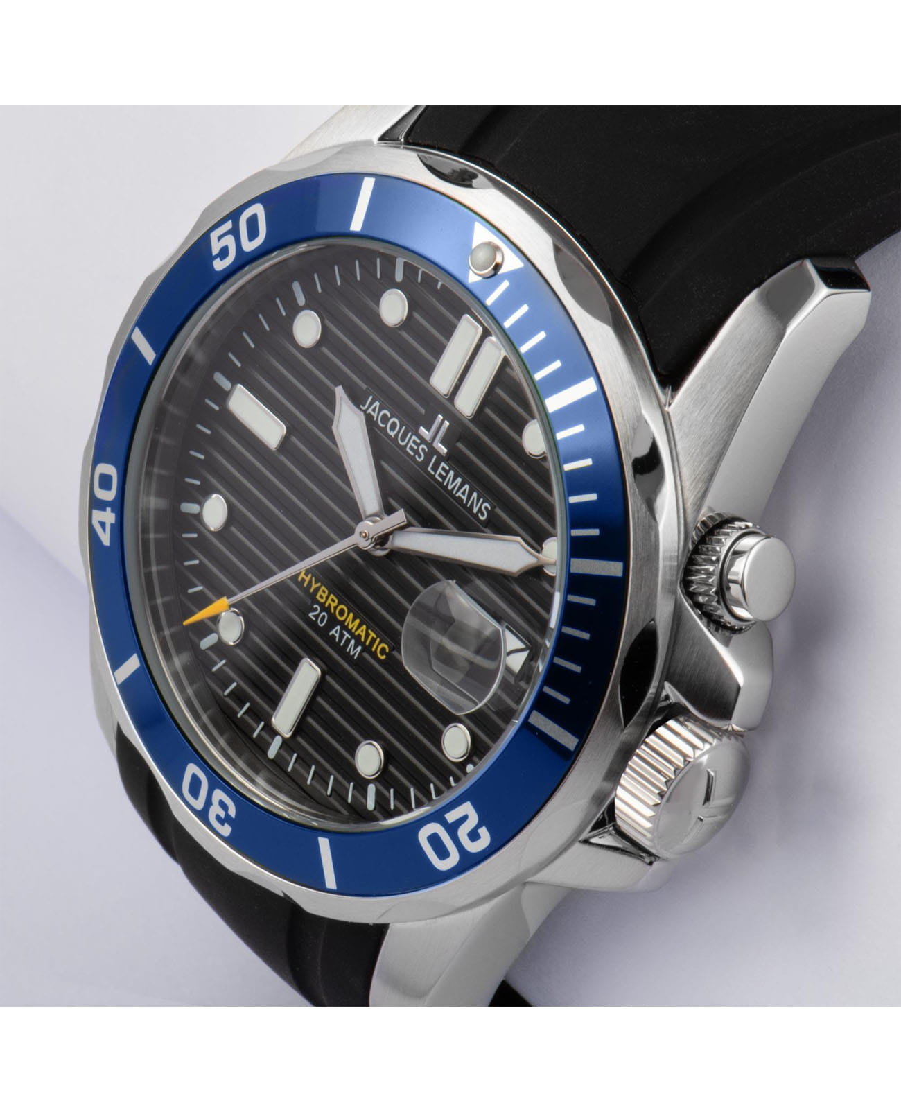 Мужские часы Jacques Lemans Hybromatic 1-2170D с минеральным стекломМинеральное стеклоМинеральное стекло представляет собой искусственно выращенный минерал кварца. Такое стекло отличается особой устойчивостью к повреждениям и царапинам. Уступает по некоторым качествам сапфировому стеклу., гибрид кварца и механики с автоподзаводом. Корпус выполенен из нержавеющей стали. Вращающийся безельБезельВнешний ободок, закрепляющий стекло. В спортивных часах так называется поворотное кольцо с делениями на циферблате, выполняет роль таймера – замеряет отрезки времени на шкале. Неподвижный безель – элемент декора. Однонаправленно вращающийся безель на дайверских часах позволяет фиксировать моменты погружения и выныривания на поверхность. из нержавеющей стали с PVDPVDУльтратонкое покрытие наносится в технике вакуумного напыления, сочетает в себе нитрид титана особой прочности со слоем золота или оксида хрома. Несёт в себе декоративную или защитную функцию. покрытием. Стрелки и метки с люминесцентным покрытиемЛюминесцентное покрытиеПозволяет считывать показания времени в темноте. Производители наносят на стрелки, часовые индексы, безель или поверхность циферблата светонакопительный состав, дающий холодное свечение.. Окошко даты находится в положении 3 часов. Класс водозащиты: 200 метров, позволит плавать, нырять и заниматься другими водными видами спорта. Силиконовый ремешок на стандартной застежке.