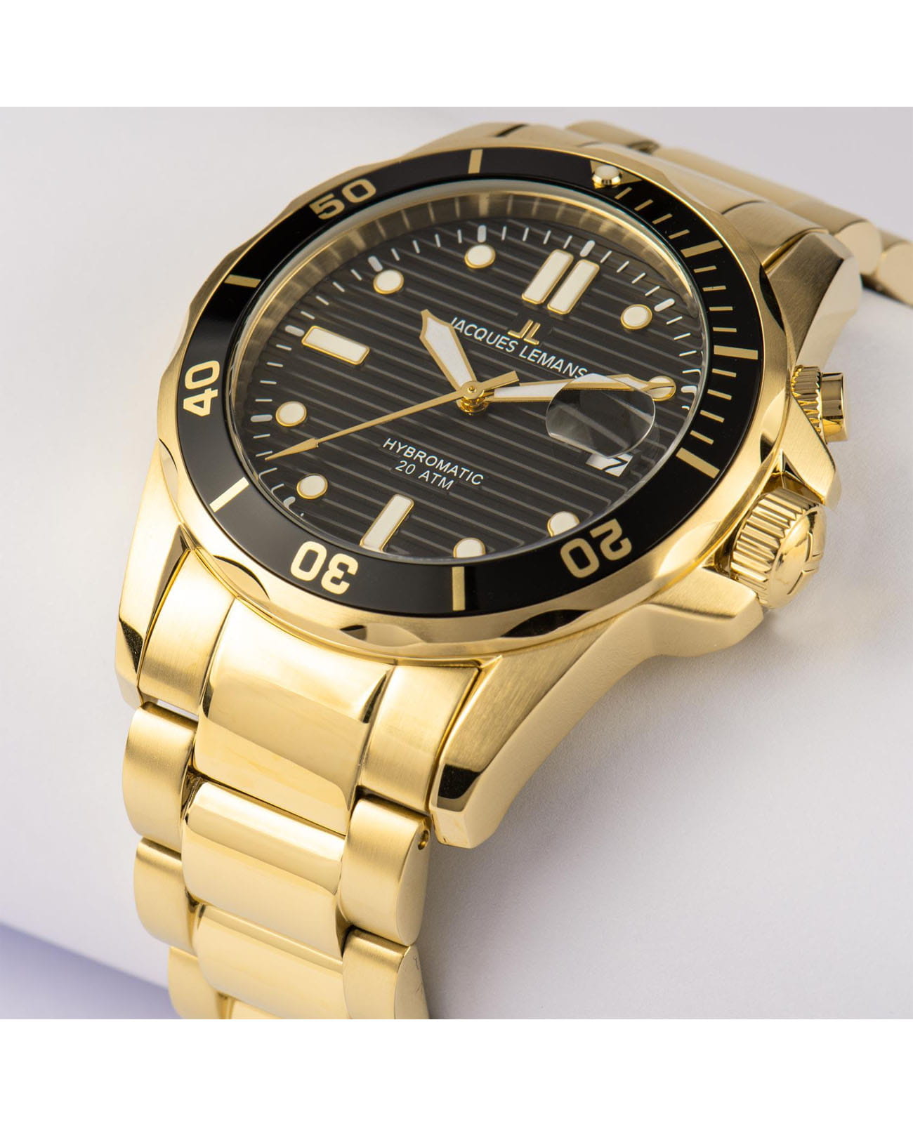 Мужские часы Jacques Lemans Hybromatic 1-2170M с минеральным стекломМинеральное стеклоМинеральное стекло представляет собой искусственно выращенный минерал кварца. Такое стекло отличается особой устойчивостью к повреждениям и царапинам. Уступает по некоторым качествам сапфировому стеклу., гибрид кварца и механики с автоподзаводом. Корпус выполенен из нержавеющей стали с PVD-покрытиемPVDУльтратонкое покрытие наносится в технике вакуумного напыления, сочетает в себе нитрид титана особой прочности со слоем золота или оксида хрома. Несёт в себе декоративную или защитную функцию.. Вращающийся безельБезельВнешний ободок, закрепляющий стекло. В спортивных часах так называется поворотное кольцо с делениями на циферблате, выполняет роль таймера – замеряет отрезки времени на шкале. Неподвижный безель – элемент декора. Однонаправленно вращающийся безель на дайверских часах позволяет фиксировать моменты погружения и выныривания на поверхность. из нержавеющей стали с PVDPVDУльтратонкое покрытие наносится в технике вакуумного напыления, сочетает в себе нитрид титана особой прочности со слоем золота или оксида хрома. Несёт в себе декоративную или защитную функцию. покрытием. Стрелки и метки с люминесцентным покрытиемЛюминесцентное покрытиеПозволяет считывать показания времени в темноте. Производители наносят на стрелки, часовые индексы, безель или поверхность циферблата светонакопительный состав, дающий холодное свечение.. Окошко даты находится в положении 3 часов. Класс водозащиты: 200 метров, позволит плавать, нырять и заниматься другими водными видами спорта. Стальной браслет с PVD-покрытиемPVDУльтратонкое покрытие наносится в технике вакуумного напыления, сочетает в себе нитрид титана особой прочности со слоем золота или оксида хрома. Несёт в себе декоративную или защитную функцию. на раскладной застёжкеРаскладная застёжкаТакой тип застёжки используется только на браслетах из металла. Она никогда не раскрывается полностью, происходит разделение на 2 и более частей. Раскладывающая застёжка снизит вероятность потери часов к минимуму..