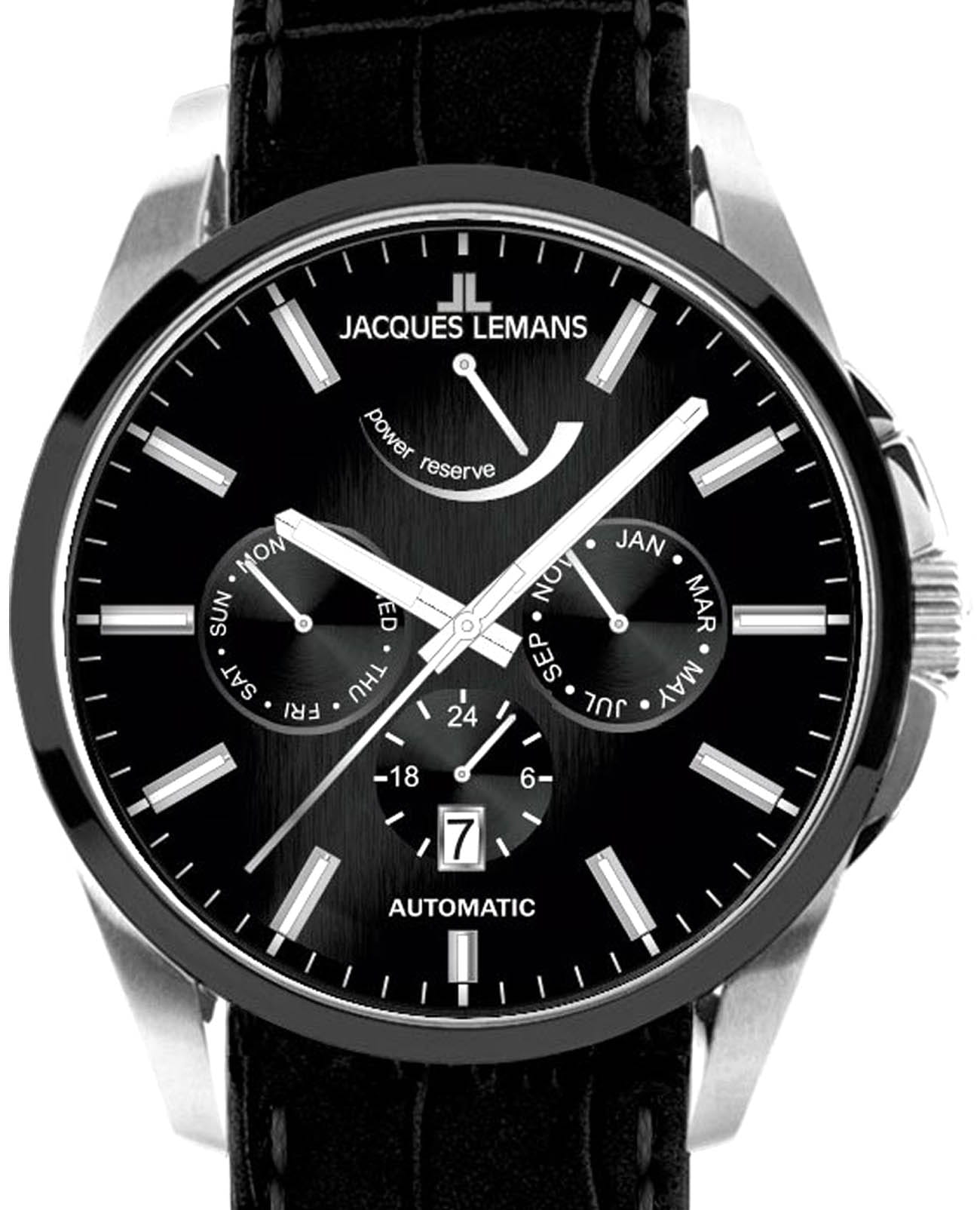 Мужские механические часы с автоподзаводом Jacques Lemans 1-2204M – лаконичная красота и изысканная элегантность. Оригинальная модель с классическим оформлением станет превосходным завершением образа, наделив его индивидуальным характером. Корпус выполнен из нержавеющей стали серебристого цвета, диаметром 44 мм, что обеспечивает долговечность и утончённый внешний вид. Минеральное стеклоМинеральное стеклоМинеральное стекло представляет собой искусственно выращенный минерал кварца. Такое стекло отличается особой устойчивостью к повреждениям и царапинам. Уступает по некоторым качествам сапфировому стеклу. с сапфировым напылением защищает циферблат от царапин. Неподвижный безельБезельВнешний ободок, закрепляющий стекло. В спортивных часах так называется поворотное кольцо с делениями на циферблате, выполняет роль таймера – замеряет отрезки времени на шкале. Неподвижный безель – элемент декора. Однонаправленно вращающийся безель на дайверских часах позволяет фиксировать моменты погружения и выныривания на поверхность. с PVD-покрытиемPVDУльтратонкое покрытие наносится в технике вакуумного напыления, сочетает в себе нитрид титана особой прочности со слоем золота или оксида хрома. Несёт в себе декоративную или защитную функцию. черного цвета. Кожаный ремешок на стандартной застёжке обеспечивает комфортное ношение. Водозащита 100 метров позволит плавать, нырять и заниматься другими водными видами спорта. Стрелки и метки с люминесцентным покрытиемЛюминесцентное покрытиеПозволяет считывать показания времени в темноте. Производители наносят на стрелки, часовые индексы, безель или поверхность циферблата светонакопительный состав, дающий холодное свечение. позволяющие легко определять время даже в темноте. 12-ти и 24-х часовой формат времени. День недели и месяц вынесены на отдельные циферблаты. Окошко даты находится в положении 6 часов. Рифленая заводная головка с защитой. Это аксессуар для мужчины, который ценит классический стиль и функциональность.