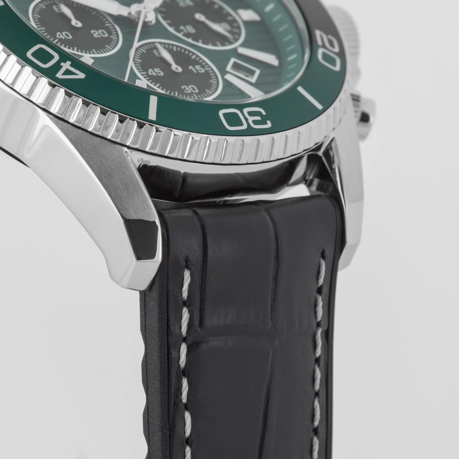Мужские кварцевые часы-хронографХронографФункция позволяет измерять отрезки времени с особой точностью: часы, минуты, секунды. Верным признаком хронографа является наличие на циферблате 3 дополнительных окошек-счётчиков. с секундомеромСекундомерСекундоме́р — прибор, способный измерять интервалы времени с точностью до долей секунды. Jacques Lemans 1-2206C – лаконичная красота и изысканная элегантность. Оригинальная модель с классическим оформлением станет превосходным завершением образа, наделив его индивидуальным характером. Корпус выполнен из нержавеющей стали серебристого цвета, диаметром 44 мм, что обеспечивает долговечность и утончённый внешний вид. Минеральное стеклоМинеральное стеклоМинеральное стекло представляет собой искусственно выращенный минерал кварца. Такое стекло отличается особой устойчивостью к повреждениям и царапинам. Уступает по некоторым качествам сапфировому стеклу. повышенной прочности Crystex защищает циферблат от царапин. Поворотный безельБезельВнешний ободок, закрепляющий стекло. В спортивных часах так называется поворотное кольцо с делениями на циферблате, выполняет роль таймера – замеряет отрезки времени на шкале. Неподвижный безель – элемент декора. Однонаправленно вращающийся безель на дайверских часах позволяет фиксировать моменты погружения и выныривания на поверхность. с PVD-покрытиемPVDУльтратонкое покрытие наносится в технике вакуумного напыления, сочетает в себе нитрид титана особой прочности со слоем золота или оксида хрома. Несёт в себе декоративную или защитную функцию. черно-зеленого цвета. Ремешок состоит из двух частей: внутренняя сделана из силикона, внешняя — из натуральной кожи. Классическая застежка с логотипом бренда. Водозащита 200 метров позволит плавать, нырять и заниматься другими водными видами спорта. Стрелки и метки с люминесцентным покрытиемЛюминесцентное покрытиеПозволяет считывать показания времени в темноте. Производители наносят на стрелки, часовые индексы, безель или поверхность циферблата светонакопительный состав, дающий холодное свечение. позволяющие легко определять время даже в темноте. 12-ти и 24-х часовой формат времени. Окошко даты находится в положении между 4 и 5 часами. Рифленая заводная головка с защитой. Это аксессуар для мужчины, который ценит классический стиль и функциональность.