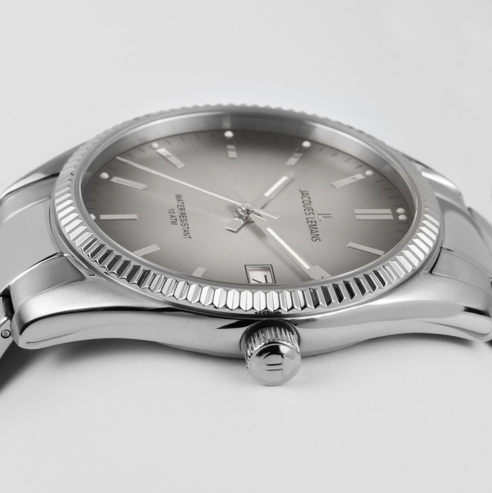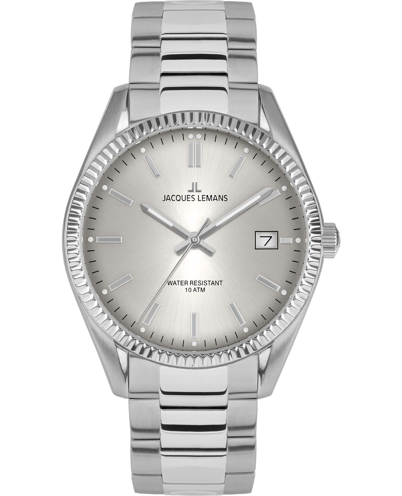 Кварцевый механизм с высокой точностью. Минеральное стеклоМинеральное стеклоМинеральное стекло представляет собой искусственно выращенный минерал кварца. Такое стекло отличается особой устойчивостью к повреждениям и царапинам. Уступает по некоторым качествам сапфировому стеклу. устойчивое к появлению царапин, обладающее высокой прозрачностью. Стрелки и метки с люминесцентным покрытиемЛюминесцентное покрытиеПозволяет считывать показания времени в темноте. Производители наносят на стрелки, часовые индексы, безель или поверхность циферблата светонакопительный состав, дающий холодное свечение.. Класс водозащиты: 100 метров, позволит плавать, нырять и заниматься другими водными видами спорта. Корпус часов изготовлен из нержавеющей стали.