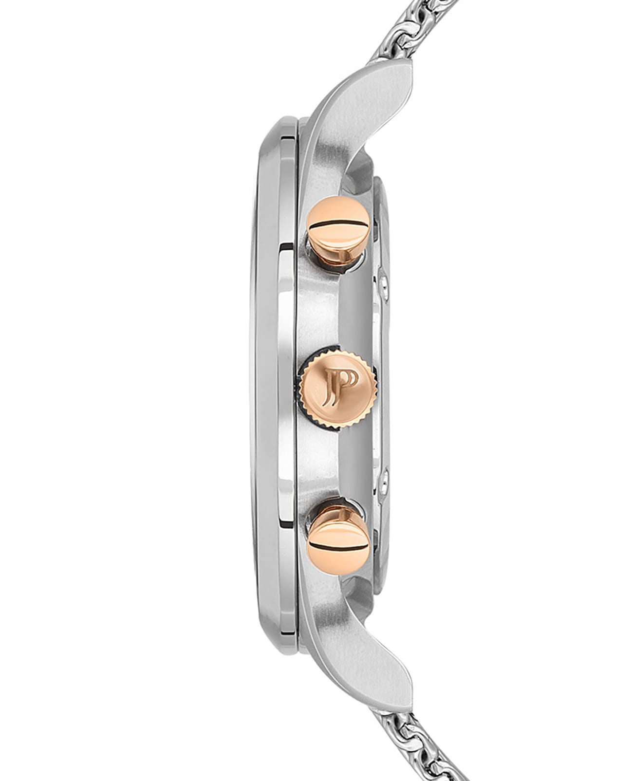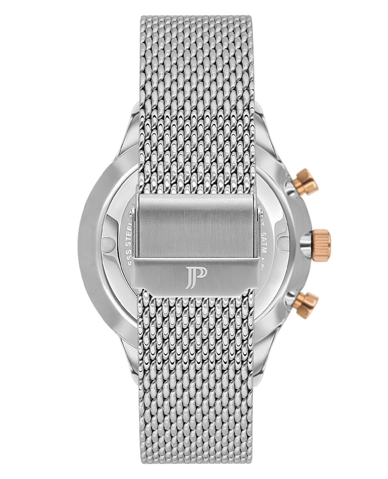 Швейцарские мужские часы-хронографХронографФункция позволяет измерять отрезки времени с особой точностью: часы, минуты, секунды. Верным признаком хронографа является наличие на циферблате 3 дополнительных окошек-счётчиков. Jacques Philippe Gallant JPQGC031246, кварцевый механизм с высокой точностью. Сапфировое стеклоСапфировое стеклоПрочный и надёжный материал из кристалла сапфира синтетического происхождения, характеризующийся особой твёрдостью и устойчивостью к царапинам и повреждениям. устойчивое к появлению царапин, обладающее высокой прозрачностью. Корпус часов изготовлен из нержавеющей стали. На циферблате три дополнительных индикатора. Стрелки с люминесцентным покрытиемЛюминесцентное покрытиеПозволяет считывать показания времени в темноте. Производители наносят на стрелки, часовые индексы, безель или поверхность циферблата светонакопительный состав, дающий холодное свечение.. Окошко даты находится между 4 и 5 часами. Класс водозащиты: 50 метров, позволит защитить корпус от случайных брызг или капель дождя. Стальной браслет миланского плетения на раскладном замкеРаскладной замокДанный вариант застежки используется только на часах с металлическим браслетом. Отличительная особенность такого крепления в том, что длина браслета становится универсальной и вы можете самостоятельно отрегулировать нужный вам размер – застежка просто двигается по браслету часов..