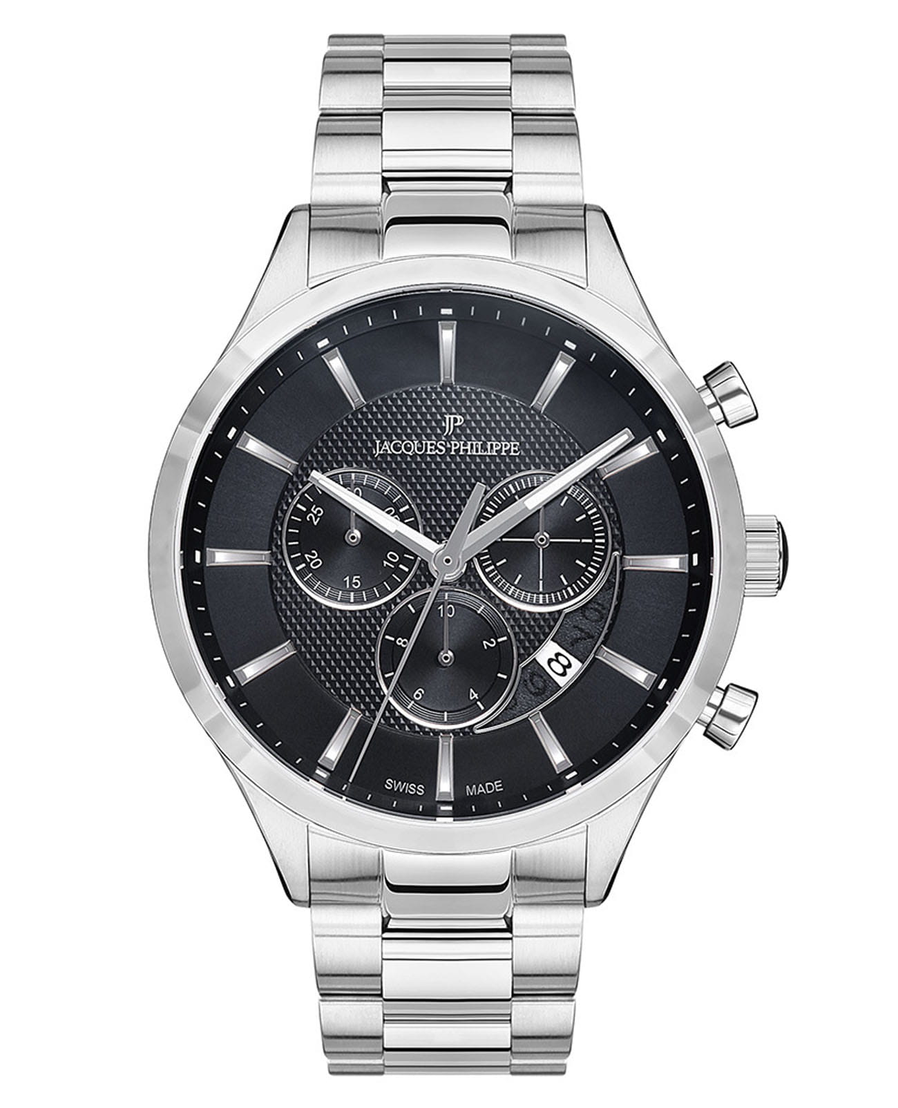 Швейцарские мужские часы-хронографХронографФункция позволяет измерять отрезки времени с особой точностью: часы, минуты, секунды. Верным признаком хронографа является наличие на циферблате 3 дополнительных окошек-счётчиков. Jacques Philippe Gallant JPQGC031316, кварцевый механизм с высокой точностью. Сапфировое стеклоСапфировое стеклоПрочный и надёжный материал из кристалла сапфира синтетического происхождения, характеризующийся особой твёрдостью и устойчивостью к царапинам и повреждениям. устойчивое к появлению царапин, обладающее высокой прозрачностью. Корпус часов изготовлен из нержавеющей стали. На циферблате три дополнительных индикатора. Стрелки с люминесцентным покрытиемЛюминесцентное покрытиеПозволяет считывать показания времени в темноте. Производители наносят на стрелки, часовые индексы, безель или поверхность циферблата светонакопительный состав, дающий холодное свечение.. Окошко даты находится между 4 и 5 часами. Класс водозащиты: 50 метров, позволит защитить корпус от случайных брызг или капель дождя. Стальной браслет на застёжке «бабочка» с кнопкамиЗастёжка "бабочка"Такой вид застёжки дополняется предохранителями, помогающими избежать случайного раскрытия браслета. Обладают изящным исполнением. .