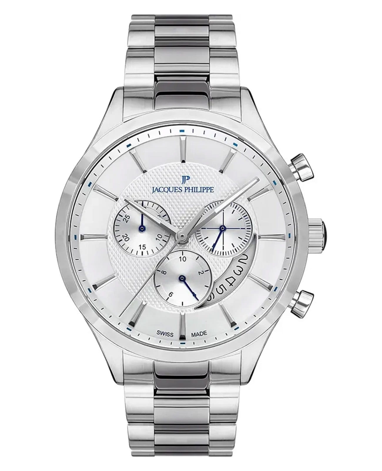 Швейцарские мужские часы-хронографХронографФункция позволяет измерять отрезки времени с особой точностью: часы, минуты, секунды. Верным признаком хронографа является наличие на циферблате 3 дополнительных окошек-счётчиков. Jacques Philippe Gallant JPQGC031329, кварцевый механизм с высокой точностью. Сапфировое стеклоСапфировое стеклоПрочный и надёжный материал из кристалла сапфира синтетического происхождения, характеризующийся особой твёрдостью и устойчивостью к царапинам и повреждениям. устойчивое к появлению царапин, обладающее высокой прозрачностью. Корпус часов изготовлен из нержавеющей стали. На циферблате три дополнительных индикатора. Стрелки с люминесцентным покрытиемЛюминесцентное покрытиеПозволяет считывать показания времени в темноте. Производители наносят на стрелки, часовые индексы, безель или поверхность циферблата светонакопительный состав, дающий холодное свечение.. Окошко даты находится между 3 и 6 часами. Класс водозащиты: 50 метров, позволит защитить корпус от случайных брызг или капель дождя. Стальной браслет на застёжке «бабочка» с кнопкамиЗастёжка "бабочка"Такой вид застёжки дополняется предохранителями, помогающими избежать случайного раскрытия браслета. Обладают изящным исполнением. .