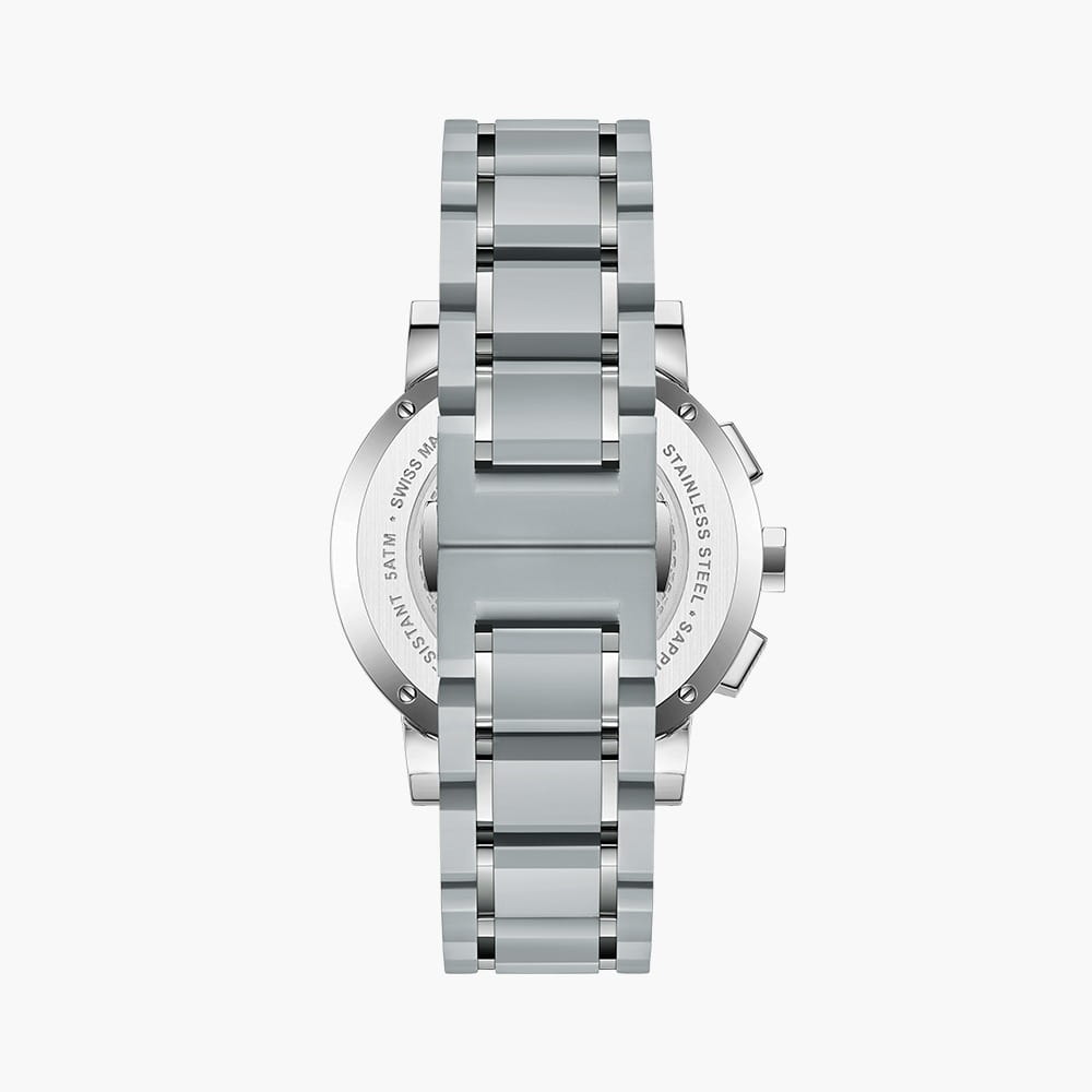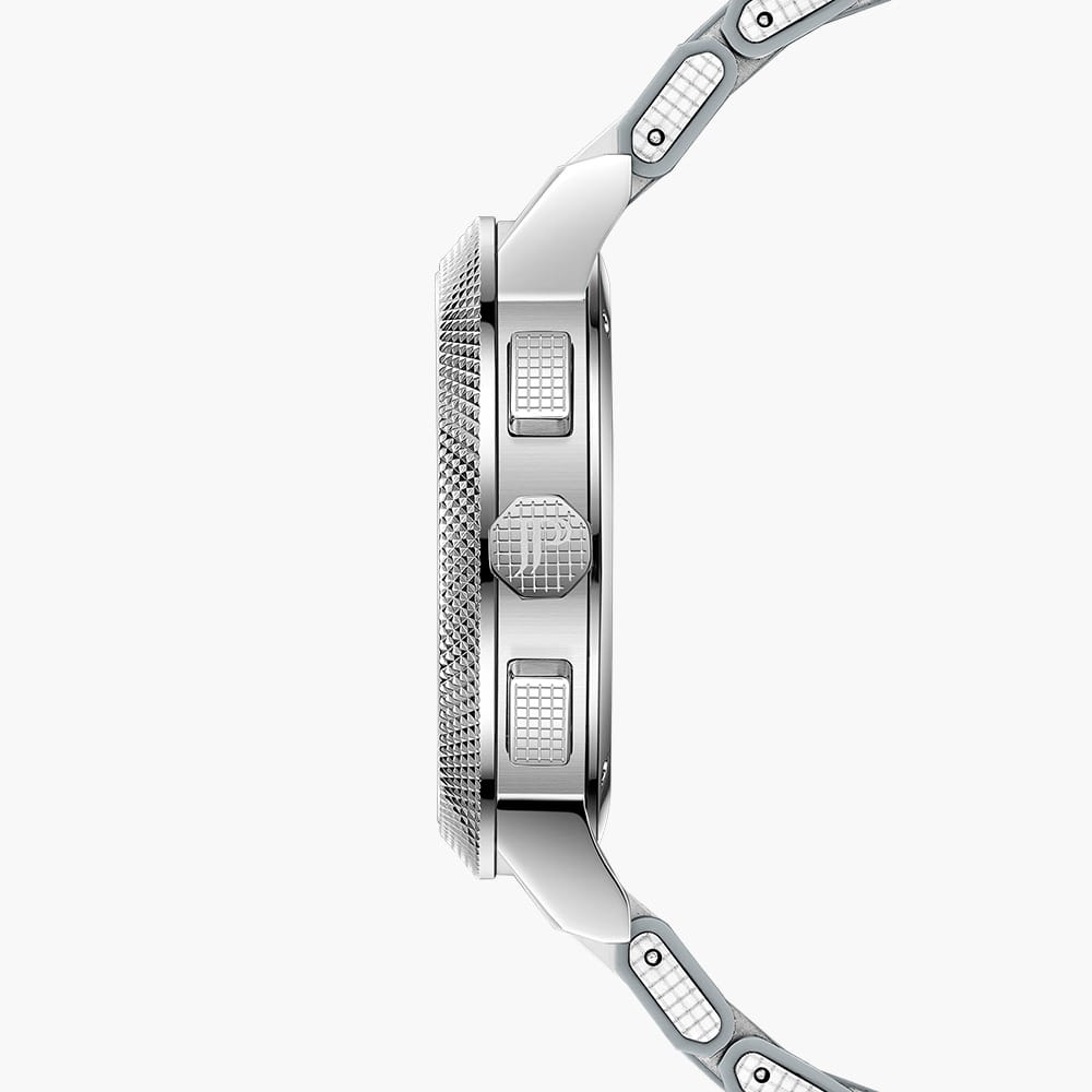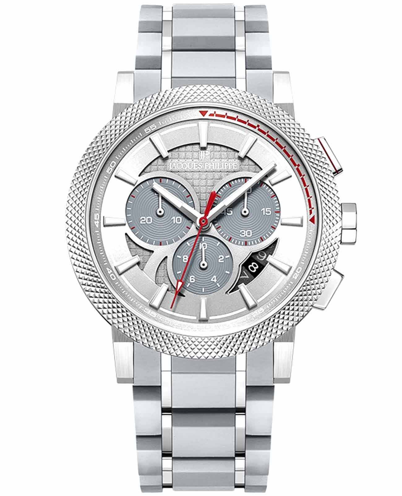 Jacques Philippe Corus JPQGC371347 — стильные швейцарские часы с функцией хронографаХронографФункция позволяет измерять отрезки времени с особой точностью: часы, минуты, секунды. Верным признаком хронографа является наличие на циферблате 3 дополнительных окошек-счётчиков. и секундомераСекундомерСекундоме́р — прибор, способный измерять интервалы времени с точностью до долей секунды., которые сочетают в себе элегантность и современный функционал. Модель оснащена точным кварцевым механизмом и надежным корпусом из нержавеющей стали 316L, что гарантирует долговечность и устойчивость к механическим воздействиям. Сапфировое стеклоСапфировое стеклоПрочный и надёжный материал из кристалла сапфира синтетического происхождения, характеризующийся особой твёрдостью и устойчивостью к царапинам и повреждениям. отличается высокой прозрачностью и устойчивостью к царапинам, сохраняя безупречный внешний вид часов даже при активном использовании. Рифленый безельБезельВнешний ободок, закрепляющий стекло. В спортивных часах так называется поворотное кольцо с делениями на циферблате, выполняет роль таймера – замеряет отрезки времени на шкале. Неподвижный безель – элемент декора. Однонаправленно вращающийся безель на дайверских часах позволяет фиксировать моменты погружения и выныривания на поверхность. добавляет уникальности. Серебристый циферблат украшен тремя дополнительными индикаторами и удобным окошком даты в положении «4 часа», а стрелки с люминесцентным покрытиемЛюминесцентное покрытиеПозволяет считывать показания времени в темноте. Производители наносят на стрелки, часовые индексы, безель или поверхность циферблата светонакопительный состав, дающий холодное свечение. обеспечивают отличную читаемость в любое время суток. Браслет из нержавеющей стали 316 с серым силиконом оснащен удобной застежкой «бабочка»Застёжка "бабочка"Такой вид застёжки дополняется предохранителями, помогающими избежать случайного раскрытия браслета. Обладают изящным исполнением. , что обеспечивает комфорт и надежность при носке. Класс водозащиты 5 ATM (50 метров) позволяет не снимать часы во время мытья рук или прогулок под дождем.