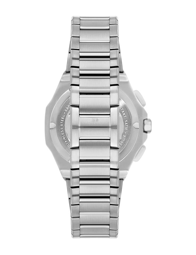 Швейцарские мужские часы-хронографХронографФункция позволяет измерять отрезки времени с особой точностью: часы, минуты, секунды. Верным признаком хронографа является наличие на циферблате 3 дополнительных окошек-счётчиков. с секундомеромСекундомерСекундоме́р — прибор, способный измерять интервалы времени с точностью до долей секунды. Jacques Philippe Octagon JPQGC391316, кварцевый механизм с высокой точностью. Сапфировое стеклоСапфировое стеклоПрочный и надёжный материал из кристалла сапфира синтетического происхождения, характеризующийся особой твёрдостью и устойчивостью к царапинам и повреждениям. устойчивое к появлению царапин, обладающее высокой прозрачностью. Корпус часов изготовлен из нержавеющей стали. На циферблате три дополнительных индикатора. Стрелки и метки с люминесцентным покрытиемЛюминесцентное покрытиеПозволяет считывать показания времени в темноте. Производители наносят на стрелки, часовые индексы, безель или поверхность циферблата светонакопительный состав, дающий холодное свечение.. Окошко даты находится в положении 6 часов. Класс водозащиты: 50 метров, позволит защитить корпус от случайных брызг или капель дождя. Стальной браслет на застёжке «бабочка» с кнопкамиЗастёжка "бабочка"Такой вид застёжки дополняется предохранителями, помогающими избежать случайного раскрытия браслета. Обладают изящным исполнением. .