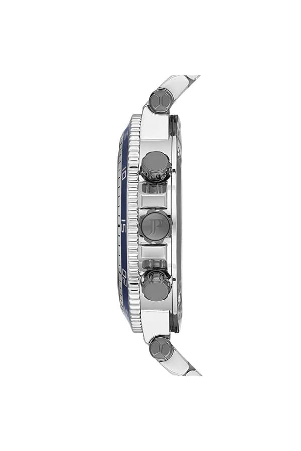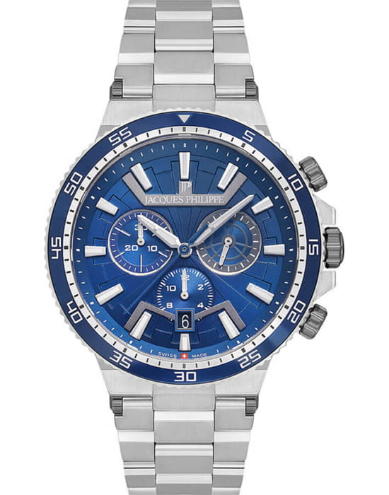 Швейцарские мужские часы-хронографХронографФункция позволяет измерять отрезки времени с особой точностью: часы, минуты, секунды. Верным признаком хронографа является наличие на циферблате 3 дополнительных окошек-счётчиков. Jacques Philippe Dynamo JPQGC447336SB, кварцевый механизм с высокой точностью. Сапфировое стеклоСапфировое стеклоПрочный и надёжный материал из кристалла сапфира синтетического происхождения, характеризующийся особой твёрдостью и устойчивостью к царапинам и повреждениям. устойчивое к появлению царапин, обладающее высокой прозрачностью. Корпус часов изготовлен из нержавеющей стали. На циферблате три дополнительных индикатора. Стрелки и метки с люминесцентным покрытиемЛюминесцентное покрытиеПозволяет считывать показания времени в темноте. Производители наносят на стрелки, часовые индексы, безель или поверхность циферблата светонакопительный состав, дающий холодное свечение.. Окошко даты находится в положении 6 часов. Класс водозащиты: 100 метров, позволит плавать, нырять и заниматься другими водными видами спорта. Стальной браслет на застёжке «бабочка» с кнопкамиЗастёжка "бабочка"Такой вид застёжки дополняется предохранителями, помогающими избежать случайного раскрытия браслета. Обладают изящным исполнением. .
