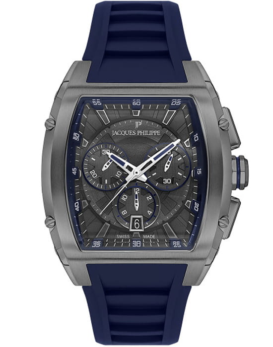 Швейцарские мужские часы-хронографХронографФункция позволяет измерять отрезки времени с особой точностью: часы, минуты, секунды. Верным признаком хронографа является наличие на циферблате 3 дополнительных окошек-счётчиков. с секундомеромСекундомерСекундоме́р — прибор, способный измерять интервалы времени с точностью до долей секунды. Jacques Philippe Quadro JPQGC468432, кварцевый механизм с высокой точностью. Сапфировое стеклоСапфировое стеклоПрочный и надёжный материал из кристалла сапфира синтетического происхождения, характеризующийся особой твёрдостью и устойчивостью к царапинам и повреждениям. устойчивое к появлению царапин, обладающее высокой прозрачностью. Корпус часов изготовлен из нержавеющей стали. На циферблате три дополнительных индикатора. Окошко даты находится в положении 6 часов. Стрелки с люминесцентным покрытиемЛюминесцентное покрытиеПозволяет считывать показания времени в темноте. Производители наносят на стрелки, часовые индексы, безель или поверхность циферблата светонакопительный состав, дающий холодное свечение.. Класс водозащиты: 50 метров, позволит защитить корпус от случайных брызг или капель дождя. Силиконовый ремешок.