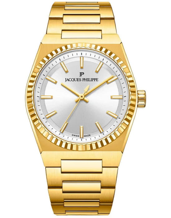 Часы Jacques Philippe JPQGLS582324 из коллекции Borealis — элегантные женские часы, сочетающие в себе швейцарское качество и современный дизайн. Корпус диаметром 34 мм выполнен из нержавеющей стали с PVD-покрытиемPVDУльтратонкое покрытие наносится в технике вакуумного напыления, сочетает в себе нитрид титана особой прочности со слоем золота или оксида хрома. Несёт в себе декоративную или защитную функцию., а зеленый циферблат защищён сапфировым стекломСапфировое стеклоПрочный и надёжный материал из кристалла сапфира синтетического происхождения, характеризующийся особой твёрдостью и устойчивостью к царапинам и повреждениям.. Внутри установлен швейцарский кварцевый механизм, обеспечивающий высокую точность хода. Водозащита 50 метров (5 ATM) защищает часы от брызг и дождя. Браслет из нержавеющей стали с PVD-покрытиемPVDУльтратонкое покрытие наносится в технике вакуумного напыления, сочетает в себе нитрид титана особой прочности со слоем золота или оксида хрома. Несёт в себе декоративную или защитную функцию. и застёжкой бабочкаЗастёжка "бабочка"Такой вид застёжки дополняется предохранителями, помогающими избежать случайного раскрытия браслета. Обладают изящным исполнением. обеспечивает комфортное ношение и надёжную фиксацию на запястье. Эти часы подойдут для тех, кто ценит сочетание элегантного дизайна и функциональности.
