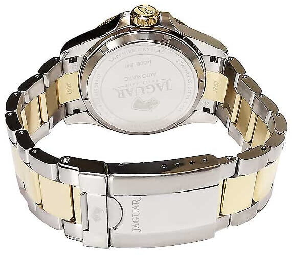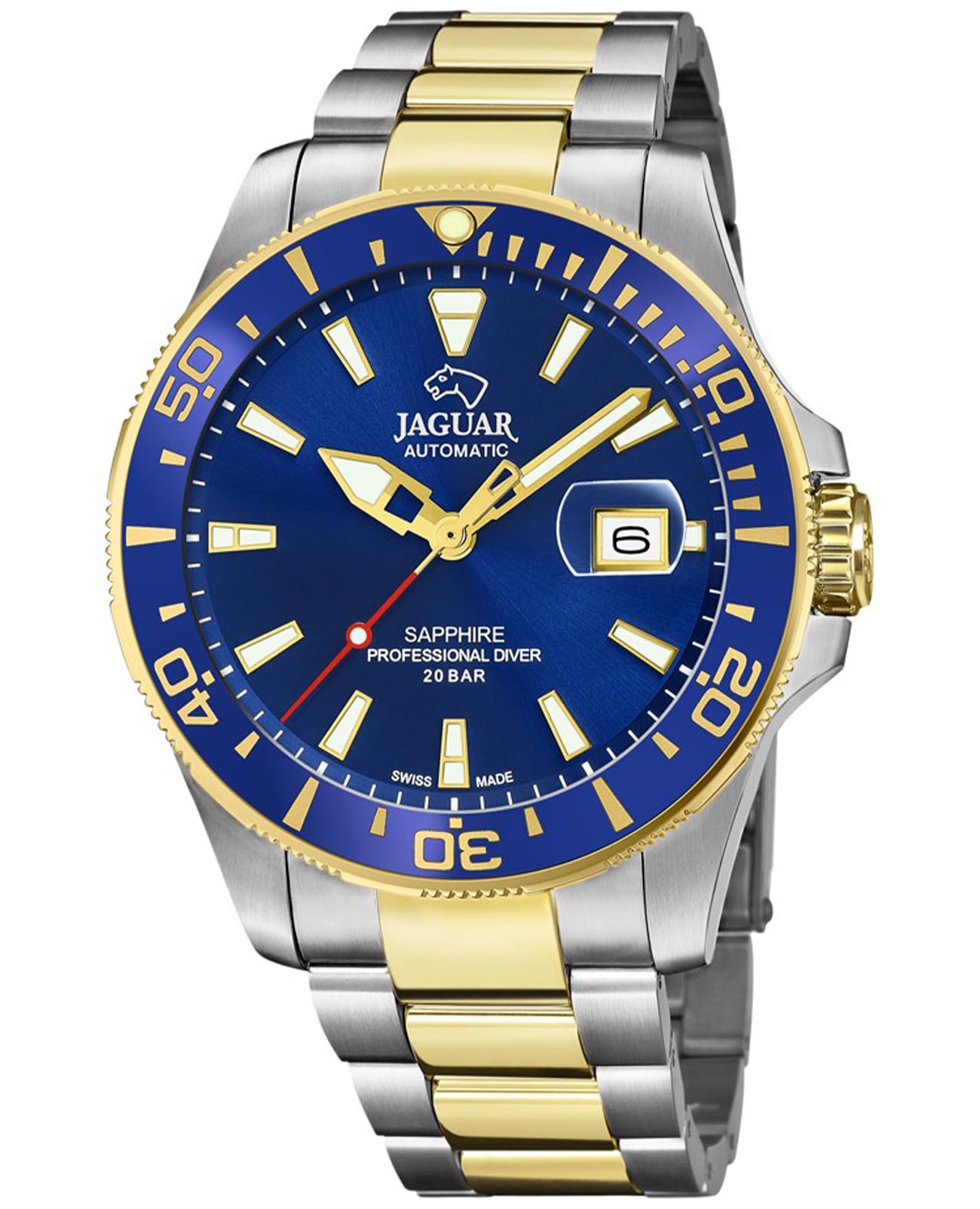 Мужские швейцарские часы Jaguar Automatic Diver J887/1. Автоматический швейцарский калибр ETA 2824-2. Сапфировое стеклоСапфировое стеклоПрочный и надёжный материал из кристалла сапфира синтетического происхождения, характеризующийся особой твёрдостью и устойчивостью к царапинам и повреждениям. устойчивое к мелким механическим повреждениям. Корпус часов изготовлен из нержавеющей стали. Стрелки и метки с люминесцентным покрытиемЛюминесцентное покрытиеПозволяет считывать показания времени в темноте. Производители наносят на стрелки, часовые индексы, безель или поверхность циферблата светонакопительный состав, дающий холодное свечение.. Окошко даты находится в положении 3 часа. Класс водозащиты: 200 метров, позволит плавать, нырять и заниматься другими водными видами спорта. Стальной браслет с частичным PVD-покрытиемPVDУльтратонкое покрытие наносится в технике вакуумного напыления, сочетает в себе нитрид титана особой прочности со слоем золота или оксида хрома. Несёт в себе декоративную или защитную функцию. на раскладной застёжкеРаскладная застёжкаТакой тип застёжки используется только на браслетах из металла. Она никогда не раскрывается полностью, происходит разделение на 2 и более частей. Раскладывающая застёжка снизит вероятность потери часов к минимуму.. БезельБезельВнешний ободок, закрепляющий стекло. В спортивных часах так называется поворотное кольцо с делениями на циферблате, выполняет роль таймера – замеряет отрезки времени на шкале. Неподвижный безель – элемент декора. Однонаправленно вращающийся безель на дайверских часах позволяет фиксировать моменты погружения и выныривания на поверхность. с PVD-покрытиемPVDУльтратонкое покрытие наносится в технике вакуумного напыления, сочетает в себе нитрид титана особой прочности со слоем золота или оксида хрома. Несёт в себе декоративную или защитную функцию..