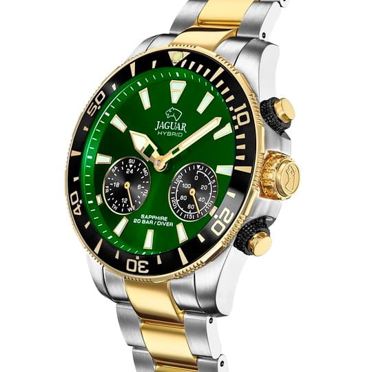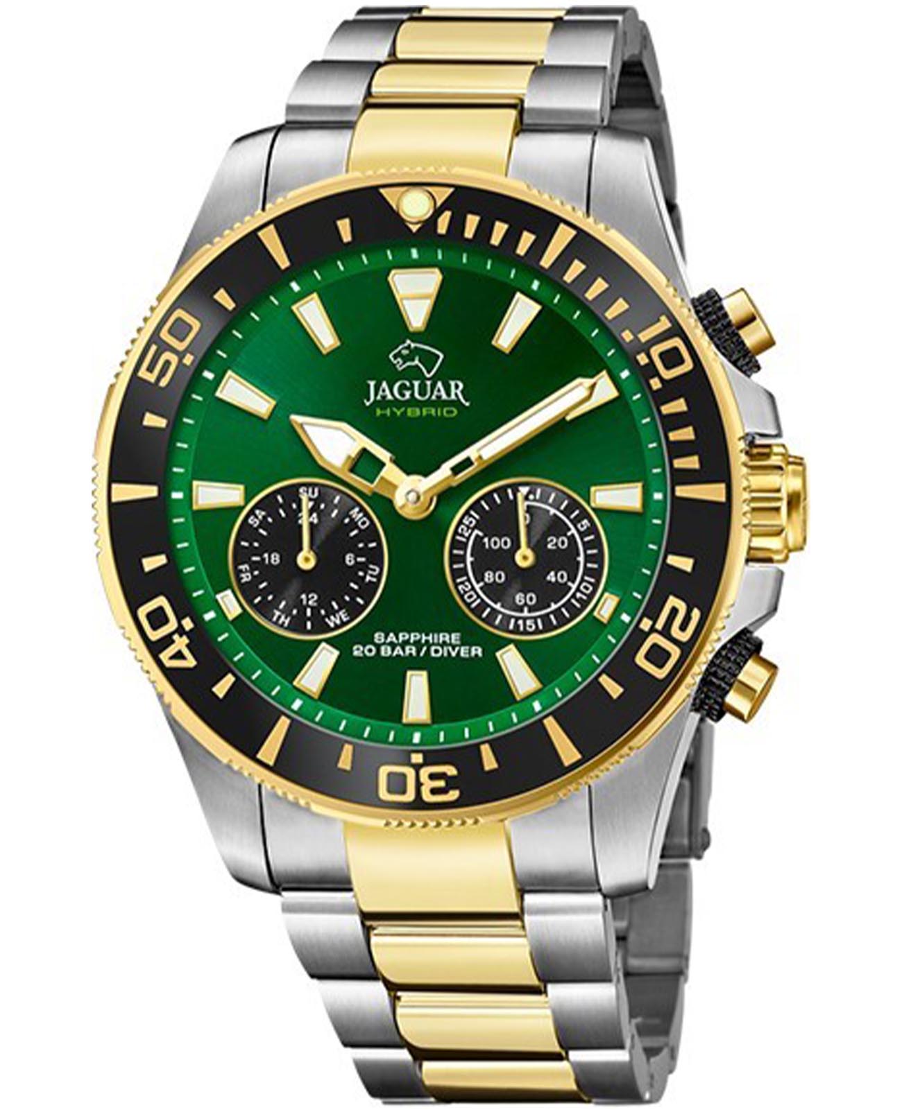 Мужские швейцарские часы Jaguar Connected J889/3. Сапфировое стеклоСапфировое стеклоПрочный и надёжный материал из кристалла сапфира синтетического происхождения, характеризующийся особой твёрдостью и устойчивостью к царапинам и повреждениям. устойчивое к мелким механическим повреждениям. Корпус часов изготовлен из нержавеющей стали. Стрелки и метки с люминесцентным покрытиемЛюминесцентное покрытиеПозволяет считывать показания времени в темноте. Производители наносят на стрелки, часовые индексы, безель или поверхность циферблата светонакопительный состав, дающий холодное свечение.. Календарь находится в положении 8 часов. Класс водозащиты: 200 метров, позволит плавать, нырять и заниматься другими водными видами спорта. Стальной браслет с частичным  PVD-покрытиемPVDУльтратонкое покрытие наносится в технике вакуумного напыления, сочетает в себе нитрид титана особой прочности со слоем золота или оксида хрома. Несёт в себе декоративную или защитную функцию. на раскладной застёжкеРаскладная застёжкаТакой тип застёжки используется только на браслетах из металла. Она никогда не раскрывается полностью, происходит разделение на 2 и более частей. Раскладывающая застёжка снизит вероятность потери часов к минимуму.. БезельБезельВнешний ободок, закрепляющий стекло. В спортивных часах так называется поворотное кольцо с делениями на циферблате, выполняет роль таймера – замеряет отрезки времени на шкале. Неподвижный безель – элемент декора. Однонаправленно вращающийся безель на дайверских часах позволяет фиксировать моменты погружения и выныривания на поверхность. с PVD-покрытиемPVDУльтратонкое покрытие наносится в технике вакуумного напыления, сочетает в себе нитрид титана особой прочности со слоем золота или оксида хрома. Несёт в себе декоративную или защитную функцию.. За точный ход работы часов, из коллекции Connected, отвечает кварцевый гибридный механизм швейцарского производства со Смарт-Модулем. Данный тип механизма обеспечивает возможность подключить часы к телефону через Bluetooth и управлять большим рядом дополнительных функций на выбор с помошью приложения Jaguar. Дополнительные функции: отображение даты и дня недели, секундомер, таймер, GMT, шагомер, поиск телефона, включение/выключение звука телефона при входящих вызовах, переключение музыки, вибро-уведомления.