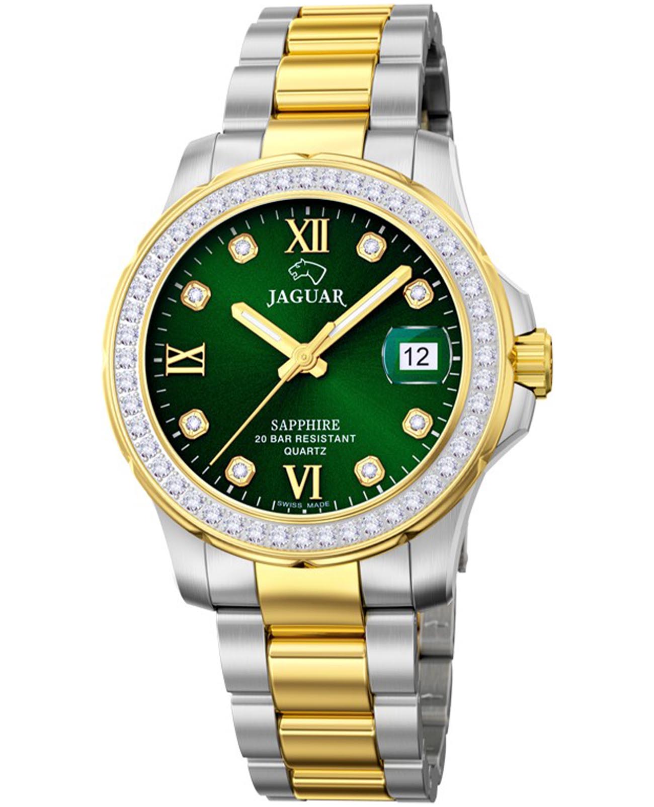 Женские швейцарские часы Jaguar Woman J893/3. Кварцевый швейцарский калибр Ronda 705. Сапфировое стеклоСапфировое стеклоПрочный и надёжный материал из кристалла сапфира синтетического происхождения, характеризующийся особой твёрдостью и устойчивостью к царапинам и повреждениям. устойчивое к мелким механическим повреждениям. Корпус и браслет часов изготовлены из нержавеющей стали, с безелем, инкрустированным цирконием. Стрелки с люминесцентным покрытиемЛюминесцентное покрытиеПозволяет считывать показания времени в темноте. Производители наносят на стрелки, часовые индексы, безель или поверхность циферблата светонакопительный состав, дающий холодное свечение.. Окошко даты находится в положении 3 часа. Класс водозащиты: 200 метров, позволит плавать, нырять и заниматься другими водными видами спорта. Стальной браслет с частичным PVD-покрытиемPVDУльтратонкое покрытие наносится в технике вакуумного напыления, сочетает в себе нитрид титана особой прочности со слоем золота или оксида хрома. Несёт в себе декоративную или защитную функцию. на раскладной застёжкеРаскладная застёжкаТакой тип застёжки используется только на браслетах из металла. Она никогда не раскрывается полностью, происходит разделение на 2 и более частей. Раскладывающая застёжка снизит вероятность потери часов к минимуму.. Циферблат украшен кристаллами в роли часовых индексов. БезельБезельВнешний ободок, закрепляющий стекло. В спортивных часах так называется поворотное кольцо с делениями на циферблате, выполняет роль таймера – замеряет отрезки времени на шкале. Неподвижный безель – элемент декора. Однонаправленно вращающийся безель на дайверских часах позволяет фиксировать моменты погружения и выныривания на поверхность. с PVD-покрытиемPVDУльтратонкое покрытие наносится в технике вакуумного напыления, сочетает в себе нитрид титана особой прочности со слоем золота или оксида хрома. Несёт в себе декоративную или защитную функцию. инкрустирован кристаллами.
