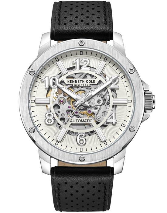 Мужские механические часы-скелетоны с минеральным стекломМинеральное стеклоМинеральное стекло представляет собой искусственно выращенный минерал кварца. Такое стекло отличается особой устойчивостью к повреждениям и царапинам. Уступает по некоторым качествам сапфировому стеклу. Kenneth Cole New York KCWGE0013104, механический механизм (автоматический калибр) с высокой точностью. Класс водозащиты: 30 метров, позволит защитить корпус от случайных брызг или капель дождя. Кожаный ремешок на стандартной застёжке. Стрелки и метки с люминесцентным покрытиемЛюминесцентное покрытиеПозволяет считывать показания времени в темноте. Производители наносят на стрелки, часовые индексы, безель или поверхность циферблата светонакопительный состав, дающий холодное свечение..