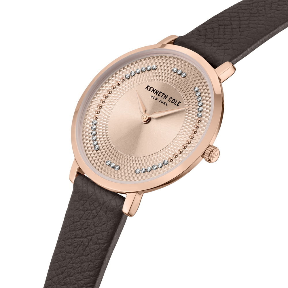 Женские кварцевые часы Kenneth Cole KCWLA0048103 — это элегантный аксессуар, подчеркивающий женственность и стиль. Корпус диаметром 34 мм выполнен из стали с IP-покрытиемIP-покрытиеМетод ионного напыления. Демонстрирует повышенную устойчивость к истиранию, окислению и химическим веществам. Под воздействием высокого давления и температуры около 1500°C молекулы металла надёжно соединяются с частицами корпуса часов. розового золота. Циферблат в тон корпуса украшен вставками из стразов из стекла, придающими сияние и изысканность. Циферблат защищён минеральным стекломМинеральное стеклоМинеральное стекло представляет собой искусственно выращенный минерал кварца. Такое стекло отличается особой устойчивостью к повреждениям и царапинам. Уступает по некоторым качествам сапфировому стеклу.. Часы оснащены ремешком из натуральной кожи коричневого цвета с классической пряжкой. Водонепроницаемость 30 м позволяет использовать часы в повседневных условиях, защищая от случайных брызг и капель дождя. Утончённый образ и внимание к деталям делают эти часы идеальным дополнением к любому образу.