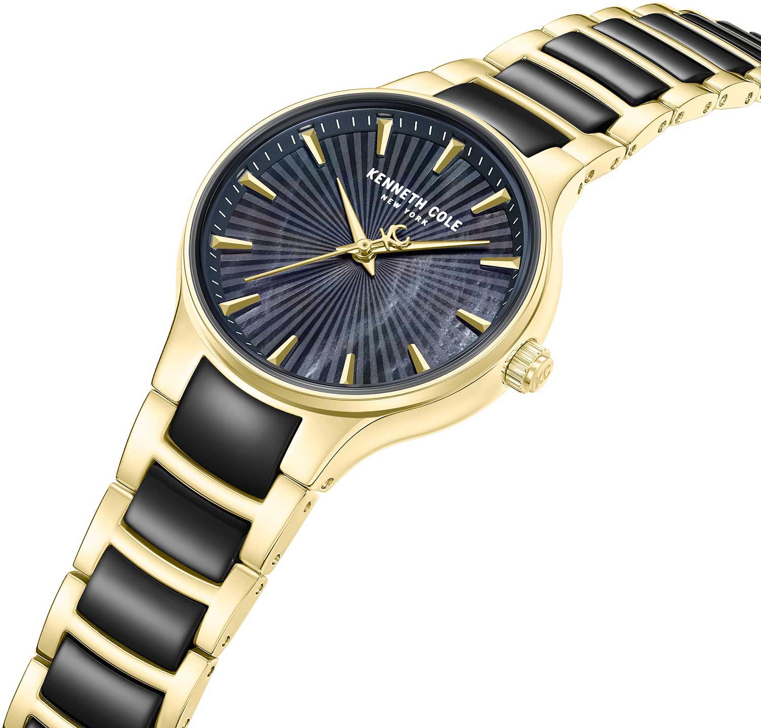 Женские кварцевые часы Kenneth Cole — это элегантный и выразительный аксессуар. Корпус диаметром 34 мм выполнен из нержавеющей стали 316L с IP-покрытиемIP-покрытиеМетод ионного напыления. Демонстрирует повышенную устойчивость к истиранию, окислению и химическим веществам. Под воздействием высокого давления и температуры около 1500°C молекулы металла надёжно соединяются с частицами корпуса часов.. Циферблат чёрного цвета оформлен штрихами и стрелками в классическом стиле Dauphine. Циферблат защищён минеральным стекломМинеральное стеклоМинеральное стекло представляет собой искусственно выращенный минерал кварца. Такое стекло отличается особой устойчивостью к повреждениям и царапинам. Уступает по некоторым качествам сапфировому стеклу. с антибликовым покрытиемАнтибликовое покрытиеСлой оксида металла в 0,13-0,3 микрон, благодаря которому стекло часов не бликует и не отражает свет. Антибликовое покрытие уменьшает отражение света в 10 раз, обеспечивая отличную читаемость показателей циферблата.. Механизм — кварцевый калибр TMI VJ21. Часы оснащены стальным браслетом с IP-покрытиемIP-покрытиеМетод ионного напыления. Демонстрирует повышенную устойчивость к истиранию, окислению и химическим веществам. Под воздействием высокого давления и температуры около 1500°C молекулы металла надёжно соединяются с частицами корпуса часов. на раскладной застёжкеРаскладная застёжкаТакой тип застёжки используется только на браслетах из металла. Она никогда не раскрывается полностью, происходит разделение на 2 и более частей. Раскладывающая застёжка снизит вероятность потери часов к минимуму.. Водонепроницаемость 30 м позволяет использовать часы в повседневных условиях. Идеальный выбор для тех, кто ценит стиль, точность и американское качество.