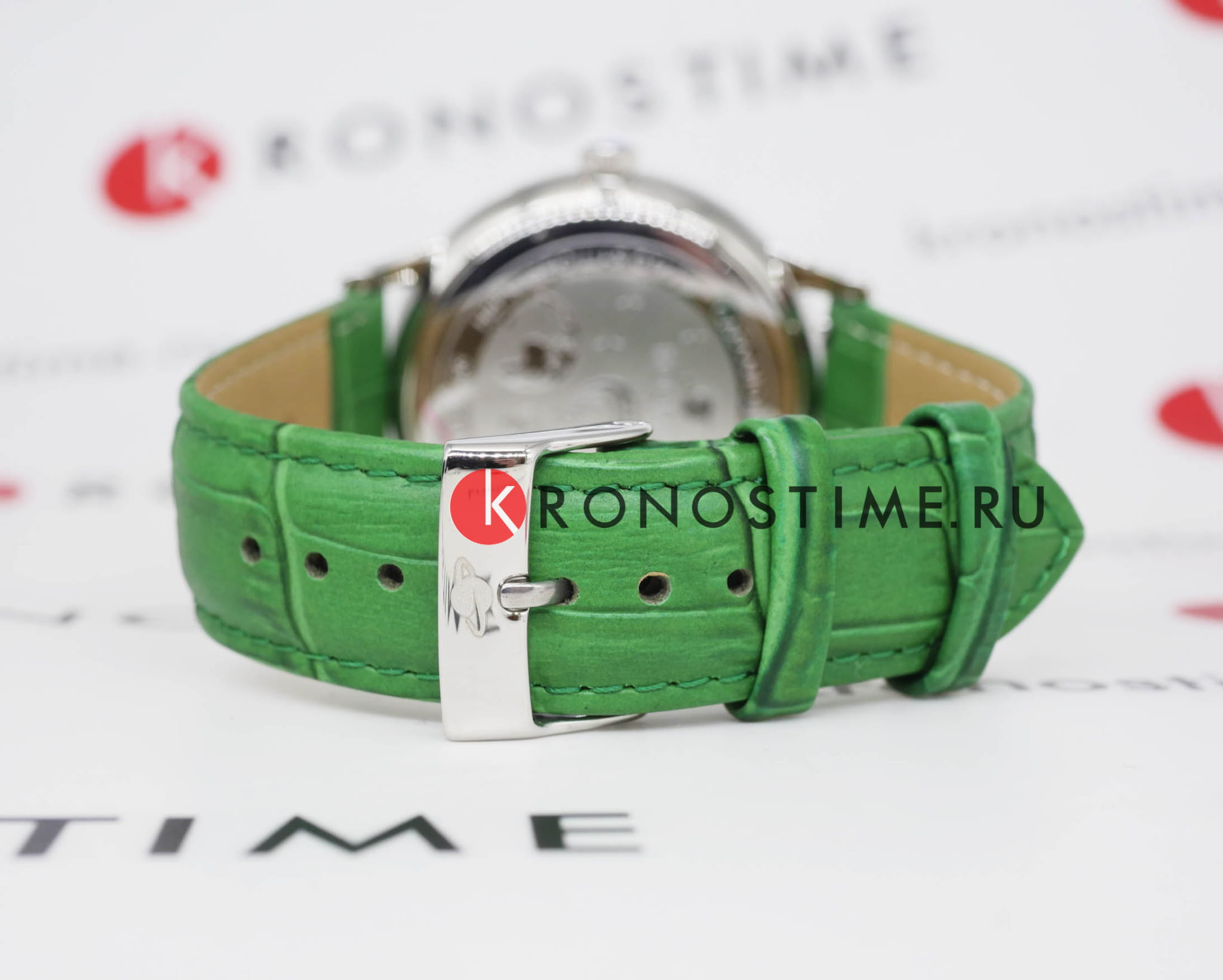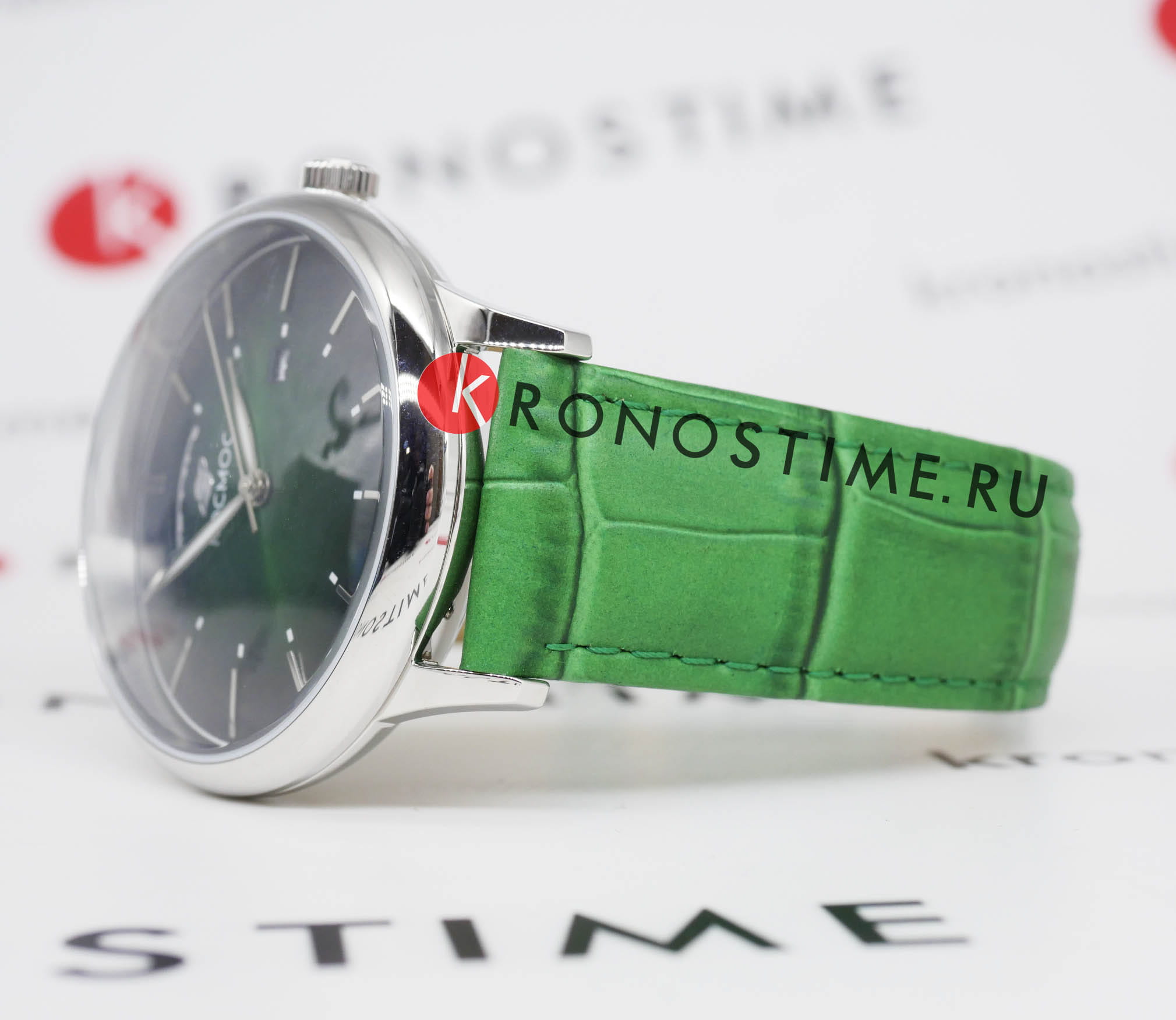 Мужские наручные часы Космос Орион K 011.17.38 — это сочетание традиций часового искусства 60-70-х годов и футуристического дизайна, вдохновленного космическими исследованиями. Они не только служат напоминанием о прошлом, но и побуждают задуматься о будущем, позволяя наслаждаться качеством и смыслом, вложенными в каждую деталь. Полированный корпус часов выполнен в виде силуэта летающей тарелки благодаря выпуклым формам стекла и нижней части корпуса. Стальные ушки, которые напоминают опоры летающей тарелки, завершает общий образ. На задней крышке часов выгравирован фантазийный сюжет – космическая станция будущего. Зеленый циферблат, выполненный в ретро-стиле, имеет выгнутые края, что требует использования сложной технологии производства. Такой дизайн был характерен для часов прошлых эпох. Секундная стрелка, имеющая изогнутую форму, идеально соответствует контуру циферблата. Выпуклый градиентный циферблат с шлифовкой, напоминающей солнечные лучи, украшен вручную изготовленными индексами, которые надежно крепятся на двух штифтах. Часовая и минутная стрелки, а также линия по краю циферблата, напоминающая ореол Земли, имеют люминесцентное покрытиеЛюминесцентное покрытиеПозволяет считывать показания времени в темноте. Производители наносят на стрелки, часовые индексы, безель или поверхность циферблата светонакопительный состав, дающий холодное свечение., которое светится в темноте, создавая впечатляющий визуальный эффект. В верхней части циферблата расположено окошко для отображения дня недели на английском языке, а индикаторы даты и дня недели дополнительно украшены фасочками, что придает им элегантный вид. Форма минерального стеклаМинеральное стеклоМинеральное стекло представляет собой искусственно выращенный минерал кварца. Такое стекло отличается особой устойчивостью к повреждениям и царапинам. Уступает по некоторым качествам сапфировому стеклу. также тщательно продумана, оно изогнуто как снаружи, так и изнутри. Это позволяет избежать искажений изображения на циферблате, в отличие от традиционного стекла с прямой внутренней частью, создающего эффект линзы. Ремешок из натуральной кожи зеленого цвета прекрасно дополняет часы. Также имеется возможность приобрести дополнительные ремни и браслеты миланского плетения, которые можно легко менять благодаря специальным крепежам. Заводная головка, застежка и ремешок украшены фирменным логотипом, подчеркивающим индивидуальность и стиль модели.