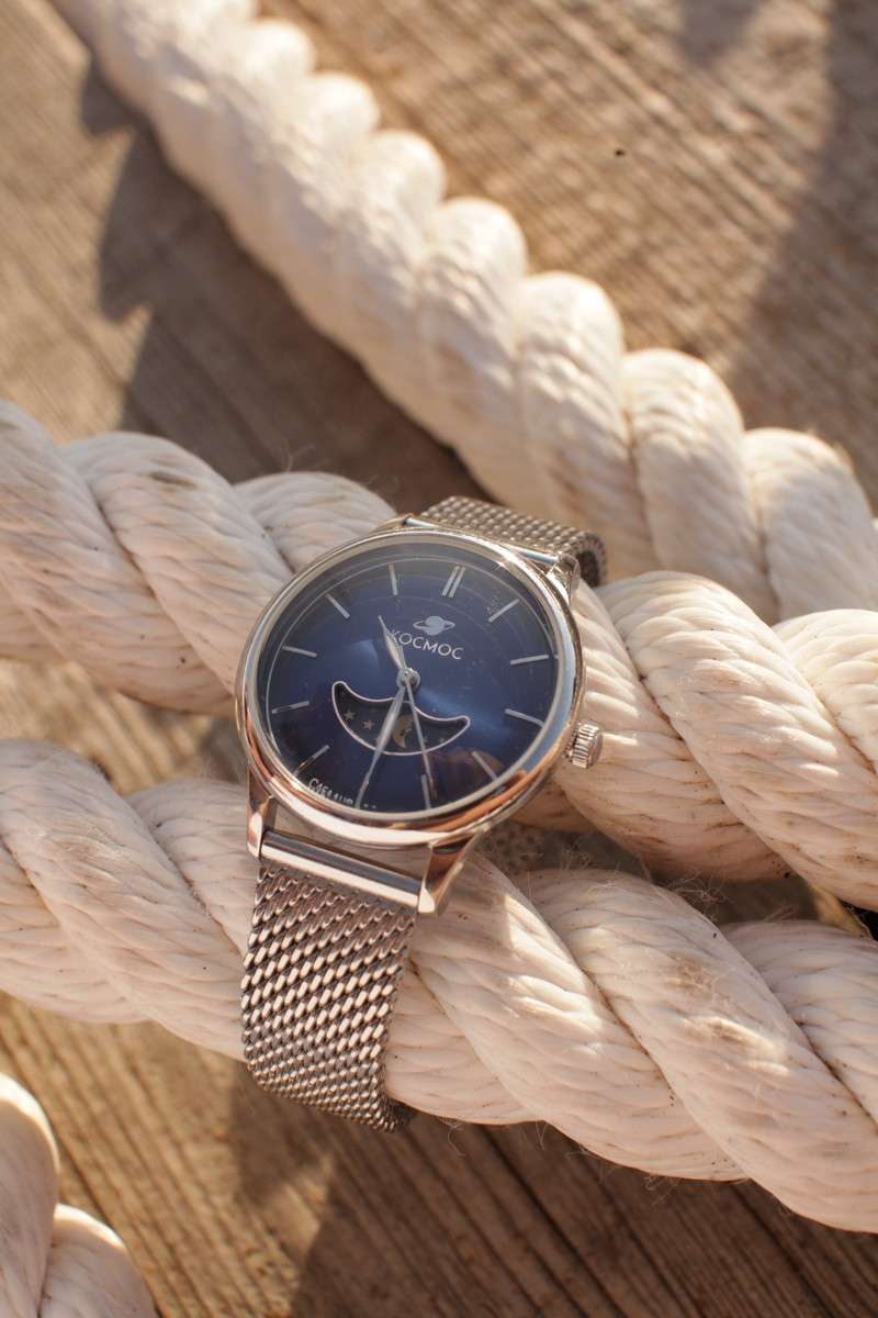 Женские наручные часы Космос Солнце и Луна K 617.10.36 — это сочетание традиций часового искусства 60-70-х годов и футуристического дизайна, вдохновленного космическими исследованиями. Они не только служат напоминанием о прошлом, но и побуждают задуматься о будущем, позволяя наслаждаться качеством и смыслом, вложенными в каждую деталь. Полированный корпус часов выполнен в виде силуэта летающей тарелки благодаря выпуклым формам стекла и нижней части корпуса. Стальные ушки, которые напоминают опоры летающей тарелки, завершает общий образ. На задней крышке часов выгравирован фантазийный сюжет – космическая станция будущего. Элегантные женские часы из серии Солнце и Луна выделяются функцией день/ночь. Циферблат выполнен в ретро-стиле с выгнутыми краями, что требует применения сложных технологий в производстве. Циферблаты такой формы были характерны для часов прошлых эпох. Кончик секундной стрелки изогнут в соответствии с формой циферблата. На градиентном выпуклом циферблате выполнена шлифовка в стиле солнечных лучей, а также размещены индексы, изготовленные вручную и закрепленные на двух штифтах.  Часовая и минутная стрелки, а также круг по краю циферблата, напоминающий ореол Земли, с  люминесцентным покрытиемЛюминесцентное покрытиеПозволяет считывать показания времени в темноте. Производители наносят на стрелки, часовые индексы, безель или поверхность циферблата светонакопительный состав, дающий холодное свечение., которое светится в темноте, создавая завораживающий эффект. Форма минерального стеклаМинеральное стеклоМинеральное стекло представляет собой искусственно выращенный минерал кварца. Такое стекло отличается особой устойчивостью к повреждениям и царапинам. Уступает по некоторым качествам сапфировому стеклу. тщательно продумана: оно выгнуто как снаружи, так и изнутри. Такое решение позволяет избежать искажения изображения на циферблате, в отличие от стекла с прямой внутренней частью, которое создает эффект линзы. Модель оснащена гибким и прочным браслетом миланского плетения. Заводная головка, застежка и ремешок украшены фирменным логотипом.