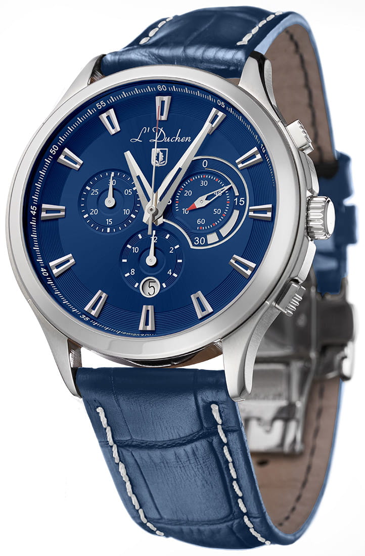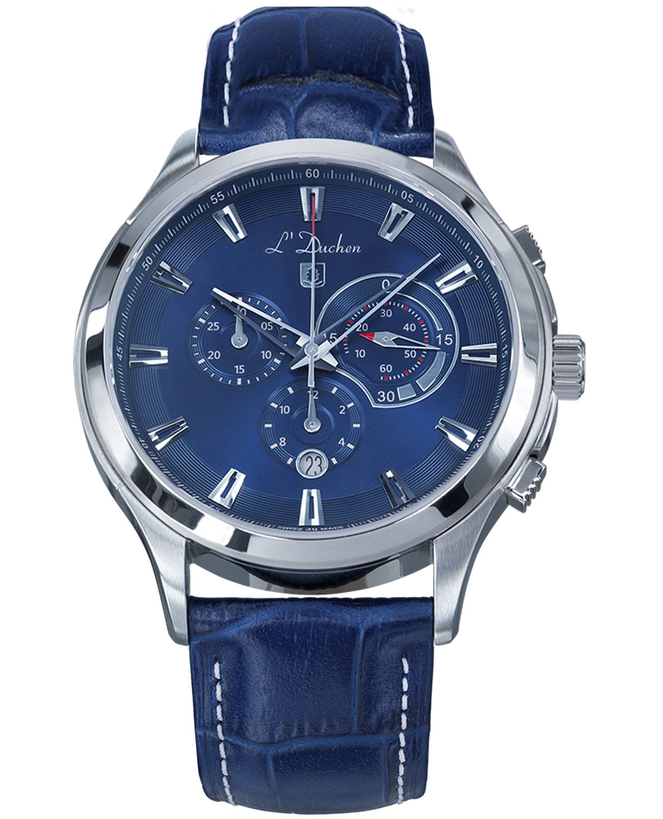 Мужские швейцарские часы- хронографХронографФункция позволяет измерять отрезки времени с особой точностью: часы, минуты, секунды. Верным признаком хронографа является наличие на циферблате 3 дополнительных окошек-счётчиков. L'Duchen Pilotage D 742.13.37, кварцевый механизм с высокой точностью. Сапфировое стеклоСапфировое стеклоПрочный и надёжный материал из кристалла сапфира синтетического происхождения, характеризующийся особой твёрдостью и устойчивостью к царапинам и повреждениям. устойчивое к появлению царапин, обладающее высокой прозрачностью. Корпус часов выполнен из нержавеющей стали. Класс водозащиты: 50 метров, позволит защитить корпус от случайных брызг или капель дождя. Кожаный ремешок на застёжке «бабочка» с кнопкамиЗастёжка "бабочка"Такой вид застёжки дополняется предохранителями, помогающими избежать случайного раскрытия браслета. Обладают изящным исполнением. .