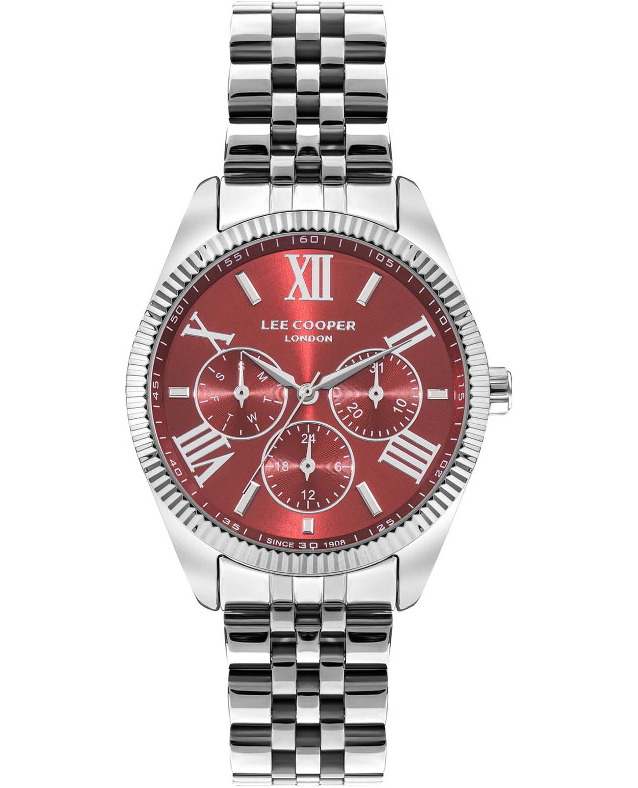 Женские часы Lee Cooper LC07811.390 — это стильное сочетание элегантности и современного дизайна. Изысканный корпус диаметром 37 мм выполнен из суперметалла серебристого цвета, придающий модели особый блеск. Циферблат красного цвета защищен минеральным стекломМинеральное стеклоМинеральное стекло представляет собой искусственно выращенный минерал кварца. Такое стекло отличается особой устойчивостью к повреждениям и царапинам. Уступает по некоторым качествам сапфировому стеклу., обеспечивающим устойчивость к царапинам. Метки в виде римских цифр. Вынесенный циферблат с 24-х часовым указателем времени, индикацией даты и дня недели. Часы оснащены надежным кварцевым механизмом, а серебристый стальной браслет на раскладной застёжкеРаскладная застёжкаТакой тип застёжки используется только на браслетах из металла. Она никогда не раскрывается полностью, происходит разделение на 2 и более частей. Раскладывающая застёжка снизит вероятность потери часов к минимуму. гарантирует комфортную посадку на запястье. Водозащита 50 метров защищает модель от случайных брызг и дождя. Lee Cooper — отличный выбор для тех, кто ценит утонченность и качество.