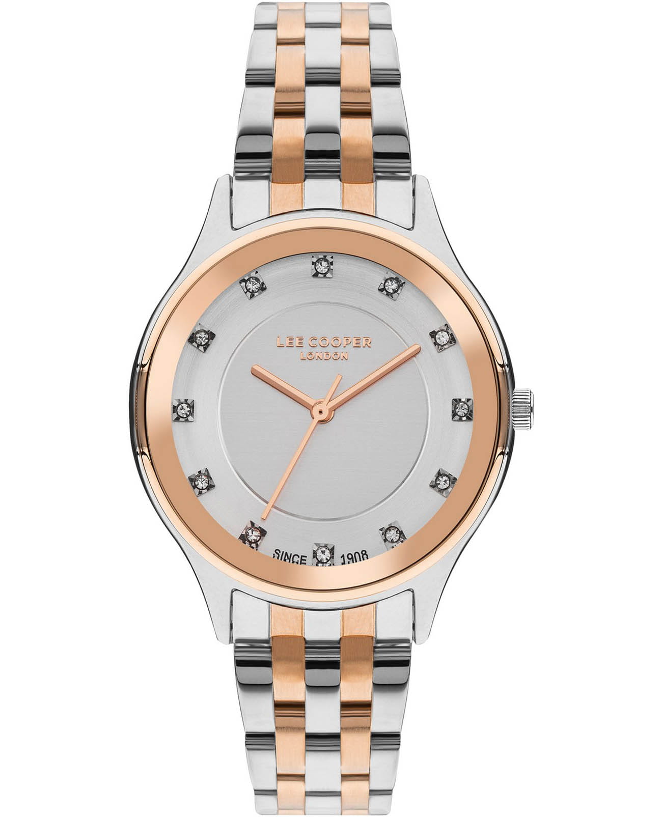 Женские часы Lee Cooper LC07867.530 выполнены в классическом стиле и сочетают строгий дизайн с надёжным механизмом. Модель оснащена кварцевым механизмом, обеспечивающим точность хода и минимальное обслуживание. Корпус круглой формы имеет размер 35 мм, изготовленный из суперметалла, идеально сбалансирован и элегантен. Неповоротный безельБезельВнешний ободок, закрепляющий стекло. В спортивных часах так называется поворотное кольцо с делениями на циферблате, выполняет роль таймера – замеряет отрезки времени на шкале. Неподвижный безель – элемент декора. Однонаправленно вращающийся безель на дайверских часах позволяет фиксировать моменты погружения и выныривания на поверхность. с IP-покрытиемIP-покрытиеМетод ионного напыления. Демонстрирует повышенную устойчивость к истиранию, окислению и химическим веществам. Под воздействием высокого давления и температуры около 1500°C молекулы металла надёжно соединяются с частицами корпуса часов..  Циферблат серебристого цвета дополнен вставками из циркона для чёткого отсчёта времени. Защиту циферблата обеспечивает минеральное стеклоМинеральное стеклоМинеральное стекло представляет собой искусственно выращенный минерал кварца. Такое стекло отличается особой устойчивостью к повреждениям и царапинам. Уступает по некоторым качествам сапфировому стеклу., устойчивое к мелким механическим повреждениям. Браслет из нержавеющей стали с частичным IP-покрытиемIP-покрытиеМетод ионного напыления. Демонстрирует повышенную устойчивость к истиранию, окислению и химическим веществам. Под воздействием высокого давления и температуры около 1500°C молекулы металла надёжно соединяются с частицами корпуса часов. фиксируется на раскладной застёжкеРаскладная застёжкаТакой тип застёжки используется только на браслетах из металла. Она никогда не раскрывается полностью, происходит разделение на 2 и более частей. Раскладывающая застёжка снизит вероятность потери часов к минимуму.. Водозащита 3 АТМ позволяет использовать часы в повседневных условиях без риска повреждения от случайных брызг воды. Это сочетание классического дизайна, прочности материалов и качества исполнения для уверенных в себе женщин.