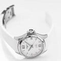 Белый перламутровый циферблат дополнен стрелками и метками с люминесцентной подсветкойЛюминесцентное покрытиеПозволяет считывать показания времени в темноте. Производители наносят на стрелки, часовые индексы, безель или поверхность циферблата светонакопительный состав, дающий холодное свечение. и украшен 9 бриллиантами общим весом 0.041 карата. Швейцарский кварцевый механизм L288 обеспечивает максимальную точность хода. Антибликовое покрытиеАнтибликовое покрытиеСлой оксида металла в 0,13-0,3 микрон, благодаря которому стекло часов не бликует и не отражает свет. Антибликовое покрытие уменьшает отражение света в 10 раз, обеспечивая отличную читаемость показателей циферблата. сапфирового стекла улучшает читаемость показаний. Дополнительные возможности: , индикатор EOLEOLПредставляет собой систему, уведомляющую владельца часов о необходимости замены элемента питания. За 2 недели до полного разряда батарейки секундная стрелка перестаёт ходить чётко и начинает перепрыгивать на 3-4 деления..