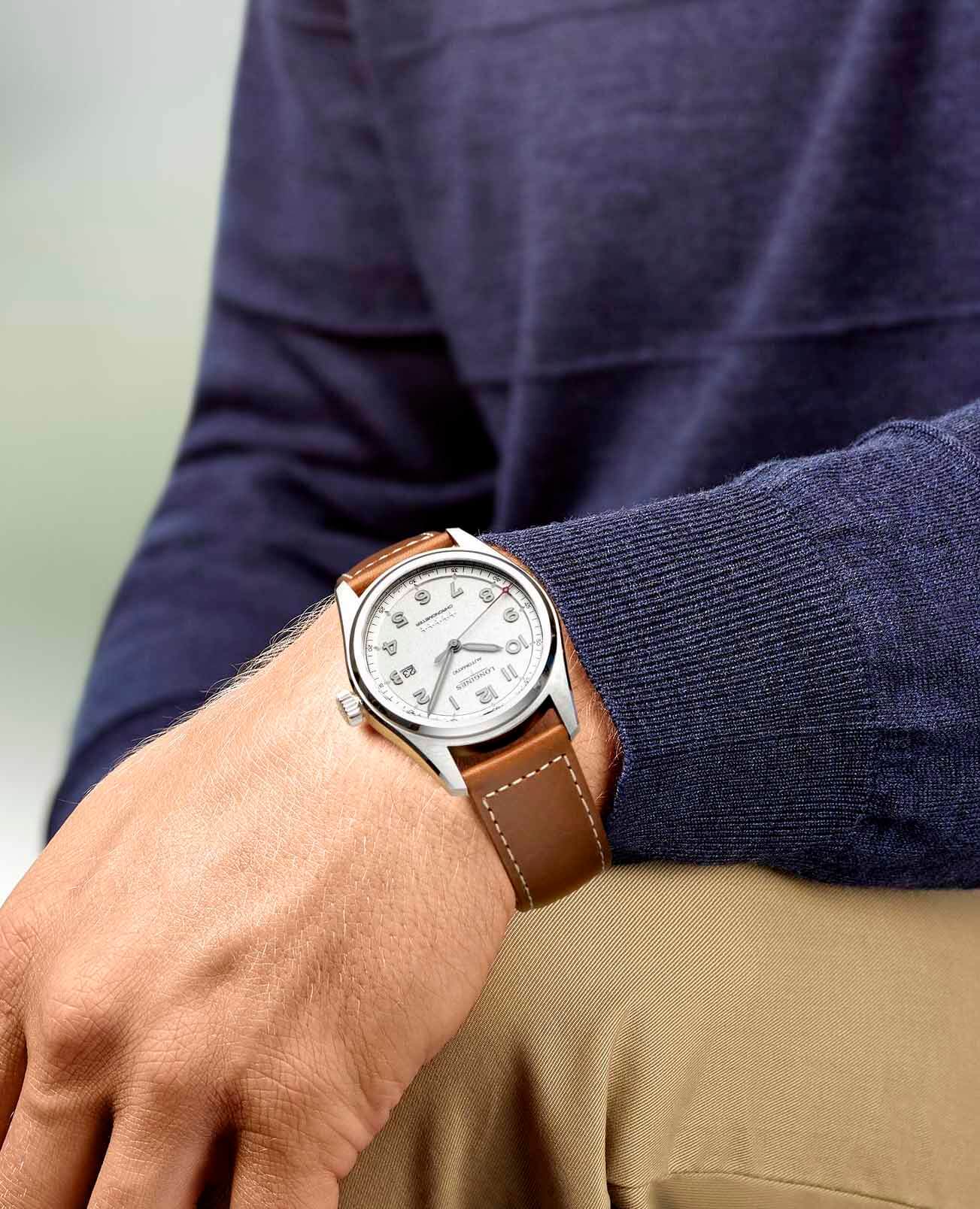 Дополнительные особенности включают сапфировое стеклоСапфировое стеклоПрочный и надёжный материал из кристалла сапфира синтетического происхождения, характеризующийся особой твёрдостью и устойчивостью к царапинам и повреждениям. с двухсторонним антибликовым покрытиемАнтибликовое покрытиеСлой оксида металла в 0,13-0,3 микрон, благодаря которому стекло часов не бликует и не отражает свет. Антибликовое покрытие уменьшает отражение света в 10 раз, обеспечивая отличную читаемость показателей циферблата., что обеспечивает отличную видимость циферблата в любых условиях. Стрелки и метки с люминесцентнымЛюминесцентное покрытиеПозволяет считывать показания времени в темноте. Производители наносят на стрелки, часовые индексы, безель или поверхность циферблата светонакопительный состав, дающий холодное свечение. покрытием облегчают чтение времени в темноте. Окошко даты удобно расположено на отметке 3 часа. Часы обладают классом водозащиты 100 метров, что позволяет использовать их для плавания и занятий водными видами спорта. Кожаный ремешок на стандартной застежке придает часам классический и элегантный вид.