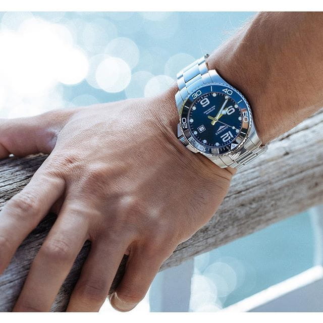 Мужские швейцарские часы Longines HydroConquest L3.840.4.96.6 – лучшее дополнение к офисному дресс-коду. Швейцарский кварцевый калибр L157 измеряет время с абсолютной точностью хода. Корпус часов выполнен из стали и алюминия. Стрелки и метки дополнены люминесцентным покрытиемЛюминесцентное покрытиеПозволяет считывать показания времени в темноте. Производители наносят на стрелки, часовые индексы, безель или поверхность циферблата светонакопительный состав, дающий холодное свечение.. Сапфировое стеклоСапфировое стеклоПрочный и надёжный материал из кристалла сапфира синтетического происхождения, характеризующийся особой твёрдостью и устойчивостью к царапинам и повреждениям. имеет антибликовое покрытиеАнтибликовое покрытиеСлой оксида металла в 0,13-0,3 микрон, благодаря которому стекло часов не бликует и не отражает свет. Антибликовое покрытие уменьшает отражение света в 10 раз, обеспечивая отличную читаемость показателей циферблата.. Сохраняется водостойкость до 30 бар. Стальной браслет на раскладной застёжкеРаскладная застёжкаТакой тип застёжки используется только на браслетах из металла. Она никогда не раскрывается полностью, происходит разделение на 2 и более частей. Раскладывающая застёжка снизит вероятность потери часов к минимуму.. Важной деталью является вращающийся стальной безельБезельВнешний ободок, закрепляющий стекло. В спортивных часах так называется поворотное кольцо с делениями на циферблате, выполняет роль таймера – замеряет отрезки времени на шкале. Неподвижный безель – элемент декора. Однонаправленно вращающийся безель на дайверских часах позволяет фиксировать моменты погружения и выныривания на поверхность., изготовленный из нержавеющей стали с синим PVD-покрытиемPVDУльтратонкое покрытие наносится в технике вакуумного напыления, сочетает в себе нитрид титана особой прочности со слоем золота или оксида хрома. Несёт в себе декоративную или защитную функцию.. Дата отображается в окошке, расположенном в положении 3 часа, что добавляет дополнительное удобство в повседневном использовании.