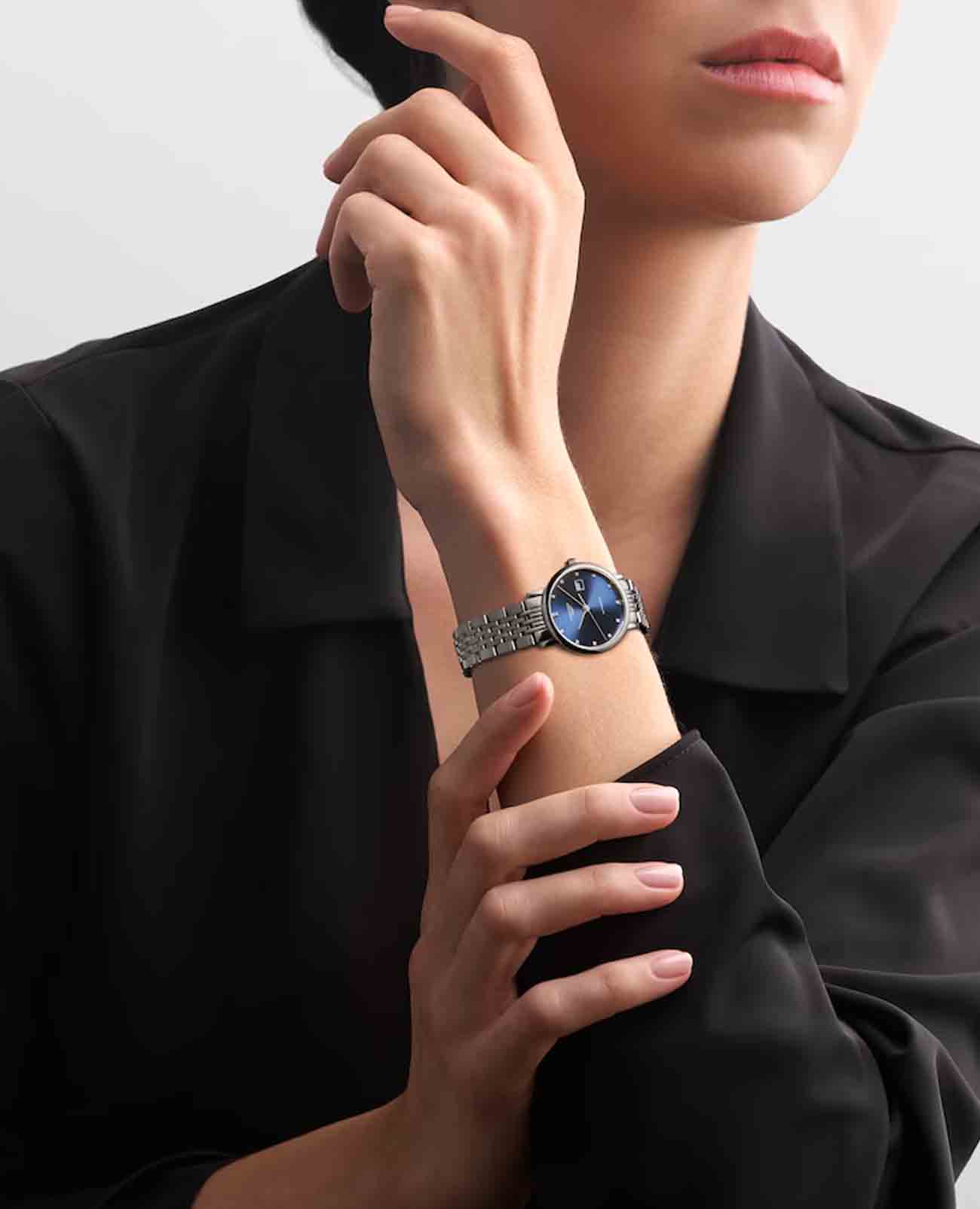 Корпус часов выполнен из нержавеющей стали, что свидетельствует о долговечности и надёжности изделия. Циферблат украшен 13 бриллиантами группы Top Wesselton VS-SI, общий вес которых составляет 0.029 карата, что придаёт часам изысканную роскошь и шарм. Внутри часов скрывается автоматический механизм с частотой баланса 28 800 полуколебаний в час и запасом хода до 45 часов, что гарантирует их бесперебойную работу. Окошко даты удобно расположено в позиции 3 часа, позволяя всегда иметь под рукой актуальную информацию. Класс водозащиты 30 метров обеспечивает защиту от случайных брызг или капель дождя. Браслет из стали с застёжкой «бабочка» с кнопкамиЗастёжка "бабочка"Такой вид застёжки дополняется предохранителями, помогающими избежать случайного раскрытия браслета. Обладают изящным исполнением. обеспечивает комфортное и надёжное крепление на запястье.