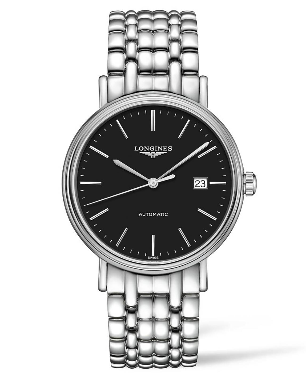 Минималистичный чёрный циферблат идеально сочетается со стальным браслетом оригинального плетения. За безупречную точность хода отвечает швейцарский автоматический калибр L888 с 64-часовым резервом хода. Сапфировое стекло защищает циферблат и является частью прозрачной задней крышки. На позиции 3 часов размещена апертура даты.