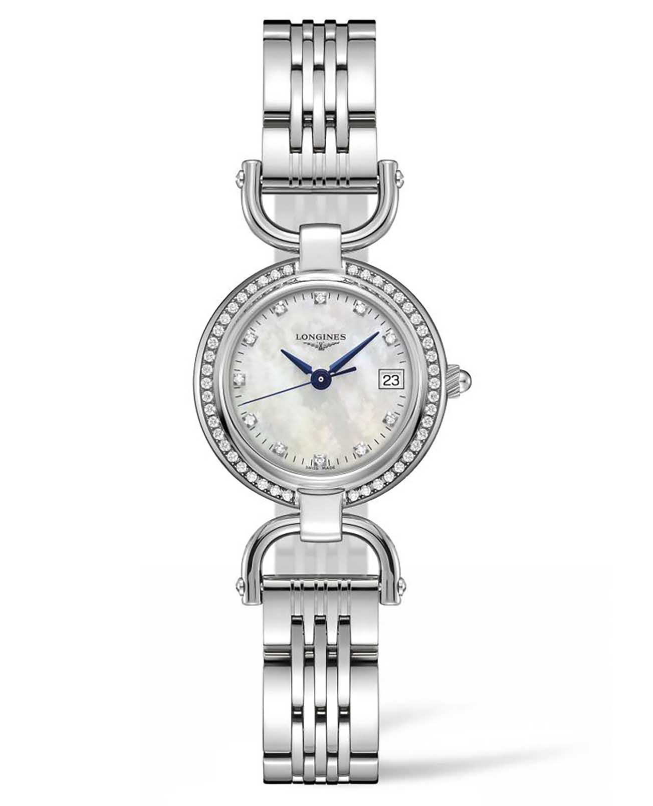Белый перламутровый циферблат инкрустирован 11 бриллиантами в 0,044 карата, безельБезельВнешний ободок, закрепляющий стекло. В спортивных часах так называется поворотное кольцо с делениями на циферблате, выполняет роль таймера – замеряет отрезки времени на шкале. Неподвижный безель – элемент декора. Однонаправленно вращающийся безель на дайверских часах позволяет фиксировать моменты погружения и выныривания на поверхность. не уступает ему по красоте: эта часть декорирована 46 бриллиантами общим весом 0,271 карата. Дизайнерские ушки скрепляют стальной корпус и браслет. Швейцарский кварцевый калибр L152 имеет высокую точность хода. Сапфировое стекло дополнено антибликовым покрытиемАнтибликовое покрытиеСлой оксида металла в 0,13-0,3 микрон, благодаря которому стекло часов не бликует и не отражает свет. Антибликовое покрытие уменьшает отражение света в 10 раз, обеспечивая отличную читаемость показателей циферблата..