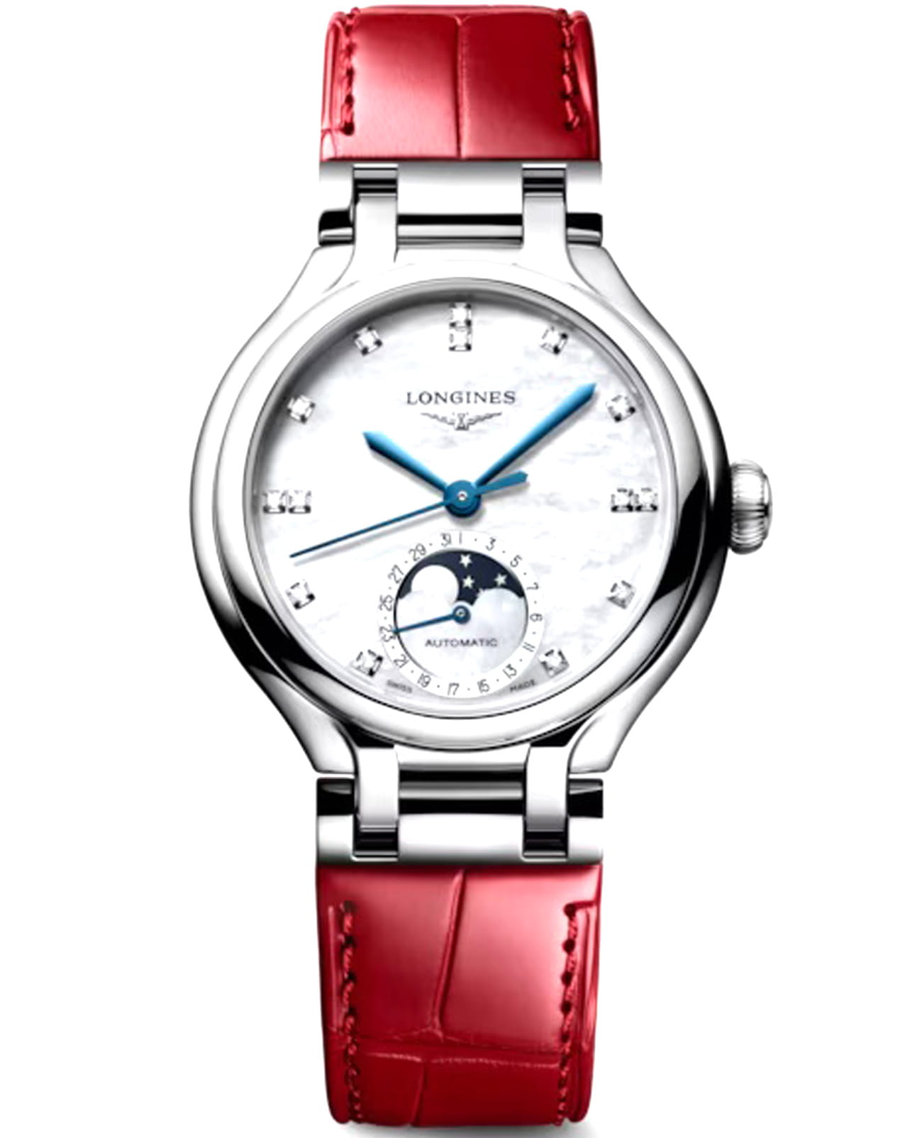 Женские швейцарские часы Longines PrimaLuna Moonphase L8.126.4.87.2 - воплощает элегантность и женственность. Исключительно женственная коллекция, созданная с тщательным вниманием к деталям, она отражает изящность. Сапфировое стеклоСапфировое стеклоПрочный и надёжный материал из кристалла сапфира синтетического происхождения, характеризующийся особой твёрдостью и устойчивостью к царапинам и повреждениям. с антибликовым покрытиемАнтибликовое покрытиеСлой оксида металла в 0,13-0,3 микрон, благодаря которому стекло часов не бликует и не отражает свет. Антибликовое покрытие уменьшает отражение света в 10 раз, обеспечивая отличную читаемость показателей циферблата. устойчивое к появлению царапин, обладающее высокой прозрачностью. Циферблат с 14 бриллиантами группы Top Wesselton VS-SI общим весом 0.060 карата. Корпус часов изготовлен из нержавеющей стали, диаметром 34 мм и толщиной 11,60 мм, идеально подходит для изящного запястья. Указатель фазы луны в положении 6 часов. Класс водозащиты: 30 метров позволит защитить корпус от случайных брызг или капель дождя. Кожаный ремень на застёжке «бабочка» с кнопкамиЗастёжка "бабочка"Такой вид застёжки дополняется предохранителями, помогающими избежать случайного раскрытия браслета. Обладают изящным исполнением. обеспечивает комфортную посадку на запястье. Внутри корпуса скрывается надежный автоматический механизм, гарантирующий точность хода и долгий срок службы. Каждая модель Longines PrimaLuna излучает красоту, которая неподвластна мимолетным тенденциям.
