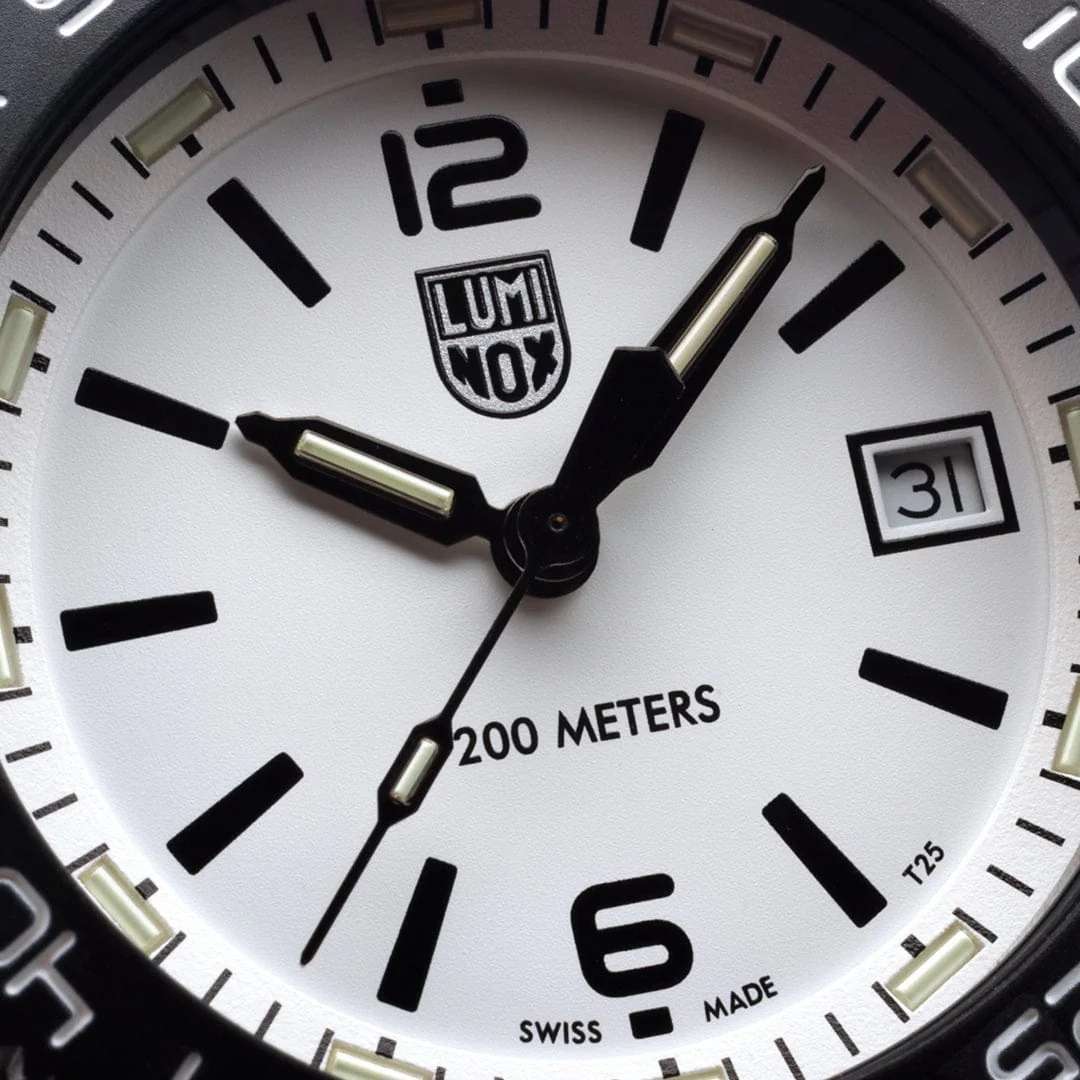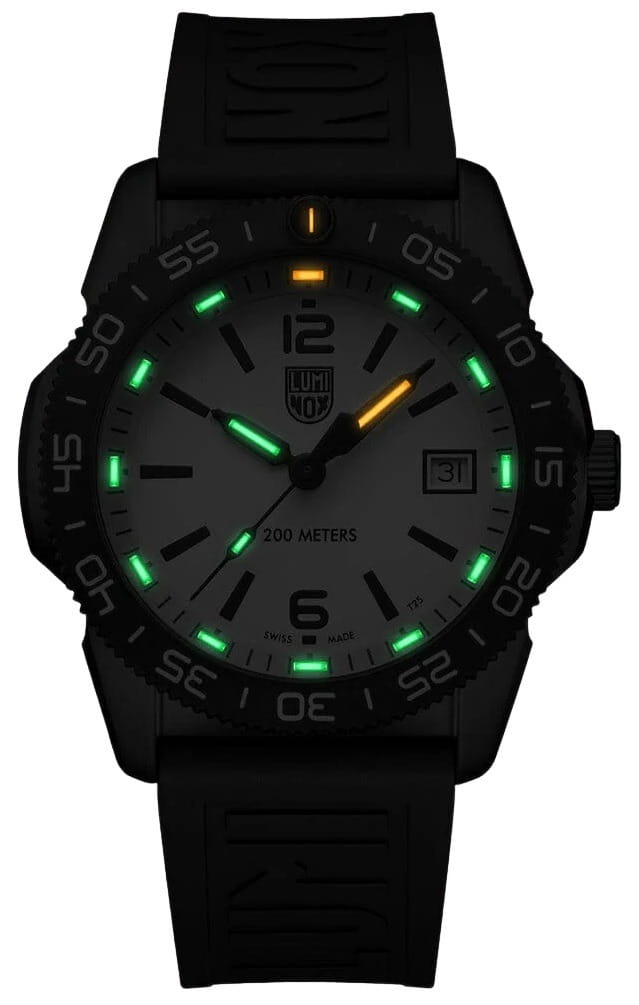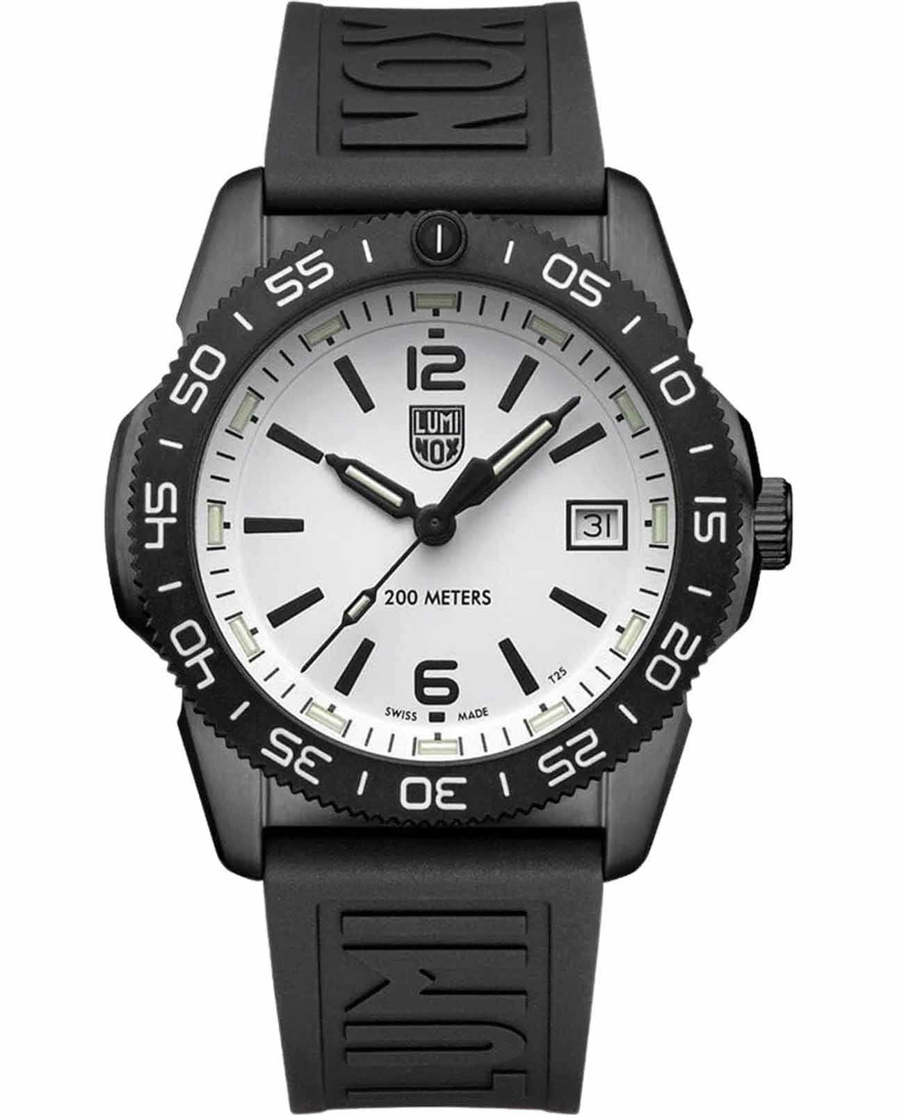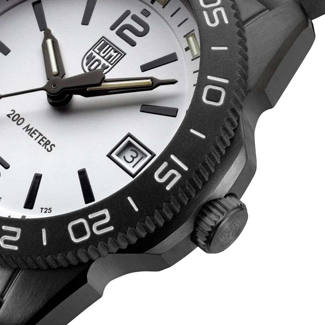 Швейцарские наручные часы Luminox Pacific Diver XS.3127M – это идеальный симбиоз стиля и высокой функциональности. Оснащенные высокоточным кварцевым механизмом, они гарантируют безупречное времяизмерение и надежность в любом случае. Белый циферблат этих часов защищен сапфировым стекломСапфировое стеклоПрочный и надёжный материал из кристалла сапфира синтетического происхождения, характеризующийся особой твёрдостью и устойчивостью к царапинам и повреждениям. с антибликовым покрытиемАнтибликовое покрытиеСлой оксида металла в 0,13-0,3 микрон, благодаря которому стекло часов не бликует и не отражает свет. Антибликовое покрытие уменьшает отражение света в 10 раз, обеспечивая отличную читаемость показателей циферблата., которое славится своей прочностью и устойчивостью к царапинам, обеспечивая кристально чистый обзор. Корпус часов выполнен из качественной стали с черным PVD-покрытиемPVDУльтратонкое покрытие наносится в технике вакуумного напыления, сочетает в себе нитрид титана особой прочности со слоем золота или оксида хрома. Несёт в себе декоративную или защитную функцию., что свидетельствует о долговечности и прочности изделия. Стрелки с LLTLLTLLT — это автономный механизм подсветки, основанный на использовании микроскопических газонаполненных элементов. Специальные герметичные капсулы из боросиликатного стекла, интегрированные в циферблат, генерируют свечение без необходимости подключения к внешним источникам энергии. Для их работы не требуется ни дополнительный свет, ни механическое воздействие (например, нажатие кнопки). Свечение возникает благодаря химическому процессу: реакция между тритием, заключенным в капсулах, и люминофорным покрытием создает стабильное автономное освещение. Технология обеспечивает энергетическую независимость и долговечность подсветки.-подсветкой, обеспечивают отличную видимость даже в условиях недостаточной освещенности, что делает их удобными для использования в любых условиях. Дополнительно часы располагают окошком даты в положении 3 часа, позволяющим быстро и удобно отслеживать текущую дату. Их внушительный класс водозащиты в 200 метров делает их идеальными для любителей водных видов спорта, таких как плавание и ныряние, не беспокоясь о повреждении механизма. Каучуковый ремешок черного цвета, надёжно фиксирующий часы на запястье с помощью раскладной застёжкиРаскладная застёжкаТакой тип застёжки используется только на браслетах из металла. Она никогда не раскрывается полностью, происходит разделение на 2 и более частей. Раскладывающая застёжка снизит вероятность потери часов к минимуму., обеспечивает комфортное ношение в течение всего дня. Стильный вращающийся безельБезельВнешний ободок, закрепляющий стекло. В спортивных часах так называется поворотное кольцо с делениями на циферблате, выполняет роль таймера – замеряет отрезки времени на шкале. Неподвижный безель – элемент декора. Однонаправленно вращающийся безель на дайверских часах позволяет фиксировать моменты погружения и выныривания на поверхность., изготовленный из карбонаКарбонОт «carbon», «carbone» - углерод, углепластик - полимерный композиционный материал из переплетённых под определенным углом между собой нитей углеродного волокна, применяется для изготовления лёгких, но прочных деталей. В часах часто используют 