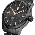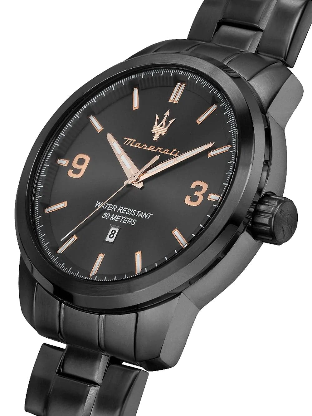 Мужские наручные часы Maserati R8853121008, кварцевый механизм (автоматический калибр) с высокой точностью. Минеральное стеклоМинеральное стеклоМинеральное стекло представляет собой искусственно выращенный минерал кварца. Такое стекло отличается особой устойчивостью к повреждениям и царапинам. Уступает по некоторым качествам сапфировому стеклу. устойчивое к появлению царапин, обладающее высокой прозрачностью. Стрелки с люминесцентным покрытиемЛюминесцентное покрытиеПозволяет считывать показания времени в темноте. Производители наносят на стрелки, часовые индексы, безель или поверхность циферблата светонакопительный состав, дающий холодное свечение.. Класс водозащиты: 50 метров, позволит защитить корпус от случайных брызг или капель дождя. Корпус часов изготовлен из нержавеющей стали с PVD-покрытиемPVDУльтратонкое покрытие наносится в технике вакуумного напыления, сочетает в себе нитрид титана особой прочности со слоем золота или оксида хрома. Несёт в себе декоративную или защитную функцию.. Браслет с раскладной застёжкойРаскладная застёжкаТакой тип застёжки используется только на браслетах из металла. Она никогда не раскрывается полностью, происходит разделение на 2 и более частей. Раскладывающая застёжка снизит вероятность потери часов к минимуму. и с PVD-покрытиемPVDУльтратонкое покрытие наносится в технике вакуумного напыления, сочетает в себе нитрид титана особой прочности со слоем золота или оксида хрома. Несёт в себе декоративную или защитную функцию..