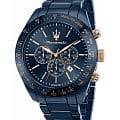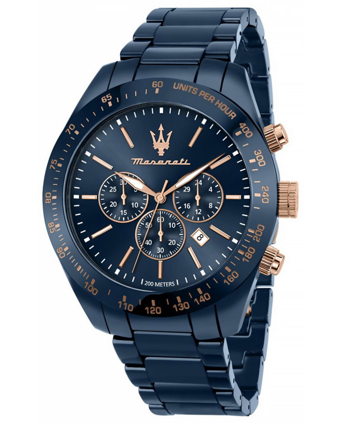 Мужские наручные часы-хронографХронографФункция позволяет измерять отрезки времени с особой точностью: часы, минуты, секунды. Верным признаком хронографа является наличие на циферблате 3 дополнительных окошек-счётчиков. Maserati R8873650002, кварцевый механизм (автоматический калибр) с высокой точностью. Минеральное стеклоМинеральное стеклоМинеральное стекло представляет собой искусственно выращенный минерал кварца. Такое стекло отличается особой устойчивостью к повреждениям и царапинам. Уступает по некоторым качествам сапфировому стеклу. устойчивое к появлению царапин, обладающее высокой прозрачностью. Стрелки с люминесцентным покрытиемЛюминесцентное покрытиеПозволяет считывать показания времени в темноте. Производители наносят на стрелки, часовые индексы, безель или поверхность циферблата светонакопительный состав, дающий холодное свечение.. Класс водозащиты: 100 метров, позволит плавать, нырять и заниматься другими водными видами спорта. Корпус часов изготовлен из нержавеющей стали с PVD-покрытиемPVDУльтратонкое покрытие наносится в технике вакуумного напыления, сочетает в себе нитрид титана особой прочности со слоем золота или оксида хрома. Несёт в себе декоративную или защитную функцию.. Браслет с раскладной застёжкойРаскладная застёжкаТакой тип застёжки используется только на браслетах из металла. Она никогда не раскрывается полностью, происходит разделение на 2 и более частей. Раскладывающая застёжка снизит вероятность потери часов к минимуму. и с PVD-покрытиемPVDУльтратонкое покрытие наносится в технике вакуумного напыления, сочетает в себе нитрид титана особой прочности со слоем золота или оксида хрома. Несёт в себе декоративную или защитную функцию..