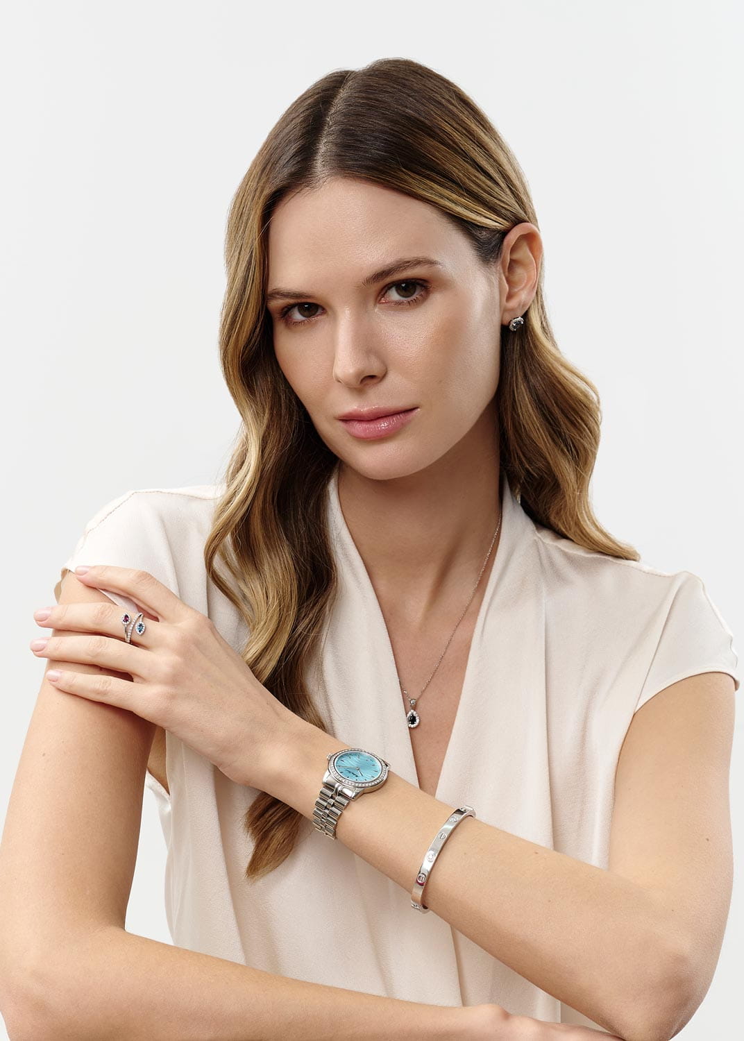 Женские кварцевые часы Mathey-Tissot Artemis D10860AQBU — это стильное сочетание элегантности и современного дизайна. Изящный корпус выполнен из стали 316L с безелемБезельВнешний ободок, закрепляющий стекло. В спортивных часах так называется поворотное кольцо с делениями на циферблате, выполняет роль таймера – замеряет отрезки времени на шкале. Неподвижный безель – элемент декора. Однонаправленно вращающийся безель на дайверских часах позволяет фиксировать моменты погружения и выныривания на поверхность., украшенным кристаллами, что придаст образу женственности и романтизма. Изысканный циферблат с метками в виде штрихов придает модели особый блеск и защищен минеральным стекломМинеральное стеклоМинеральное стекло представляет собой искусственно выращенный минерал кварца. Такое стекло отличается особой устойчивостью к повреждениям и царапинам. Уступает по некоторым качествам сапфировому стеклу., обеспечивающим устойчивость к царапинам. Центральные часовая, минутная стрелки. Часы оснащены надежным кварцевым механизмом. Стальной браслет на застёжке-бабочке с кнопкамиЗастёжка "бабочка"Такой вид застёжки дополняется предохранителями, помогающими избежать случайного раскрытия браслета. Обладают изящным исполнением. , гарантирующего комфортное и безопасное ношение. Класс водозащиты: 50 метров позволит защитить корпус от случайных брызг или капель дождя. Mathey-Tissot  — отличный выбор для тех, кто ценит утонченность и качество.