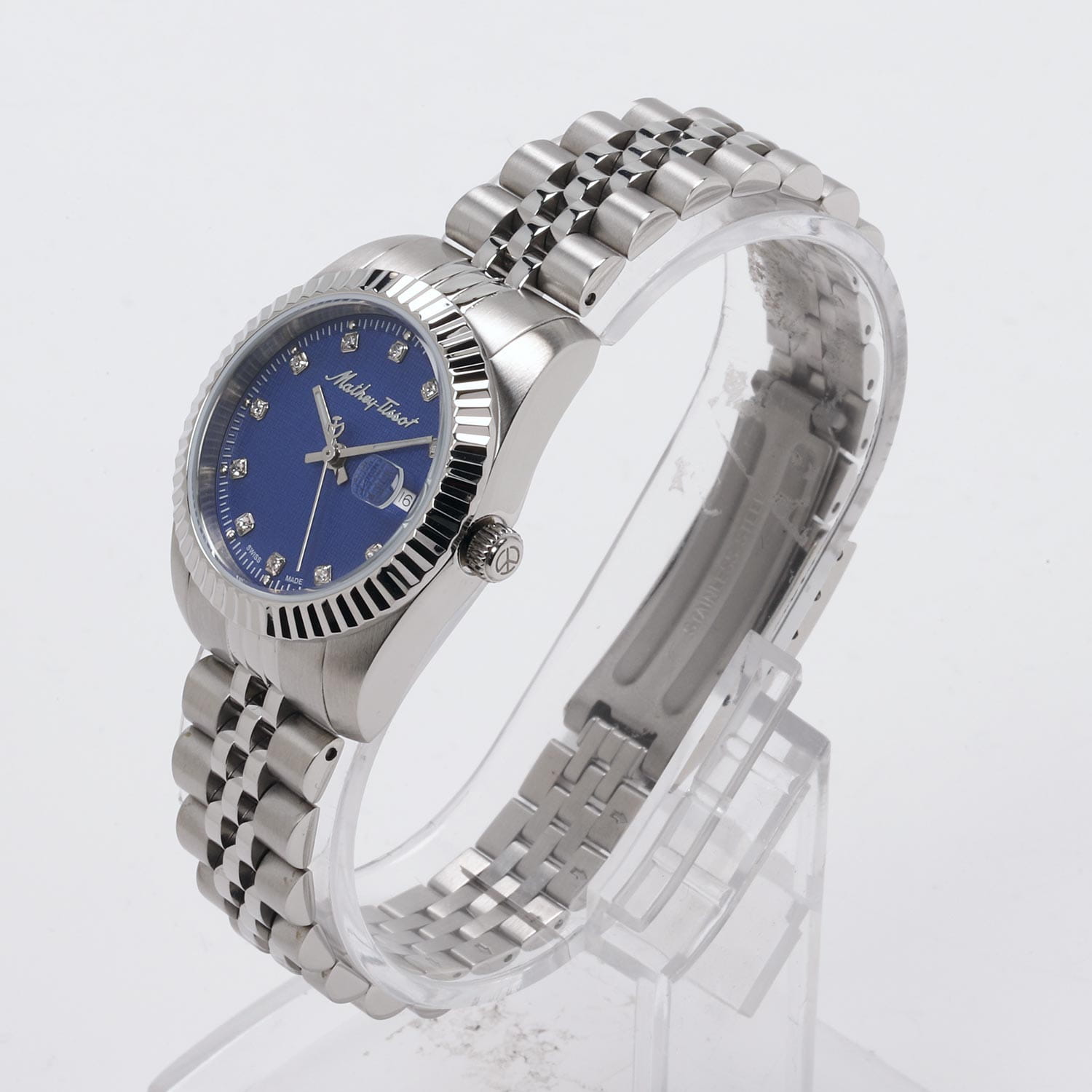 Женские кварцевые часы Mathey-Tissot Rolly D810ABU — это стильное сочетание элегантности и современного дизайна. Изящный корпус выполнен из нержавеющей стали, диаметром 30 мм, что придаст образу женственности и романтизма. Изысканный циферблат с метками в виде точек придает модели особый блеск. Циферблат защищен минеральным стекломМинеральное стеклоМинеральное стекло представляет собой искусственно выращенный минерал кварца. Такое стекло отличается особой устойчивостью к повреждениям и царапинам. Уступает по некоторым качествам сапфировому стеклу., обеспечивающий устойчивость к царапинам. Стрелки с люминесцентным покрытиемЛюминесцентное покрытиеПозволяет считывать показания времени в темноте. Производители наносят на стрелки, часовые индексы, безель или поверхность циферблата светонакопительный состав, дающий холодное свечение.. Рифленый безельБезельВнешний ободок, закрепляющий стекло. В спортивных часах так называется поворотное кольцо с делениями на циферблате, выполняет роль таймера – замеряет отрезки времени на шкале. Неподвижный безель – элемент декора. Однонаправленно вращающийся безель на дайверских часах позволяет фиксировать моменты погружения и выныривания на поверхность. серебристого цвета. Циферблат украшен кристаллами. Окошко даты находится в положении 3 часа. Часы оснащены надежным кварцевым механизмом. Стальной браслет на раскладной застёжкеРаскладная застёжкаТакой тип застёжки используется только на браслетах из металла. Она никогда не раскрывается полностью, происходит разделение на 2 и более частей. Раскладывающая застёжка снизит вероятность потери часов к минимуму., гарантирует комфортное и безопасное ношение. Класс водозащиты: 50 метров позволит защитить корпус от случайных брызг или капель дождя. Mathey-Tissot  — отличный выбор для тех, кто ценит утонченность и качество.