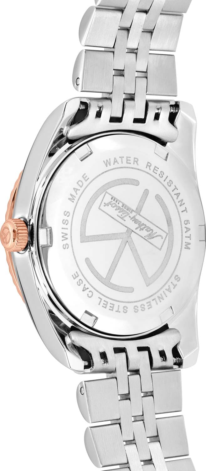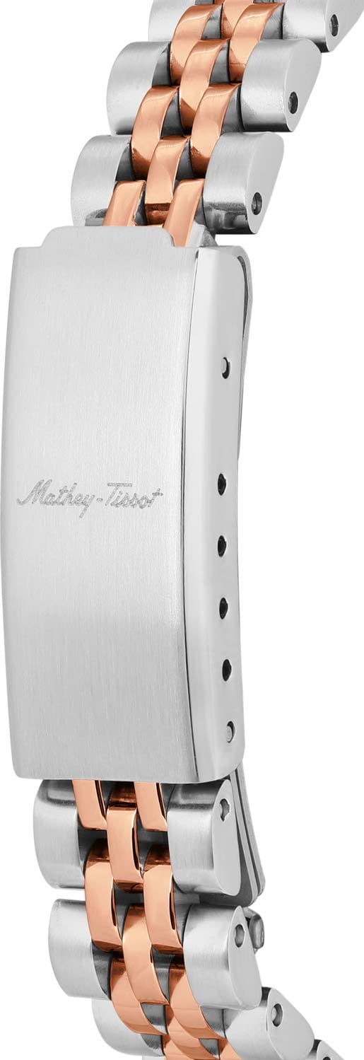 Женские кварцевые часы Mathey-Tissot Rolly D810RA — это стильное сочетание элегантности и современного дизайна. Изящный корпус выполнен из нержавеющей стали, диаметром 30 мм, что придаст образу женственности и романтизма. Изысканный циферблат с метками в виде точек придает модели особый блеск. Циферблат защищен минеральным стекломМинеральное стеклоМинеральное стекло представляет собой искусственно выращенный минерал кварца. Такое стекло отличается особой устойчивостью к повреждениям и царапинам. Уступает по некоторым качествам сапфировому стеклу., обеспечивающий устойчивость к царапинам. Стрелки с люминесцентным покрытиемЛюминесцентное покрытиеПозволяет считывать показания времени в темноте. Производители наносят на стрелки, часовые индексы, безель или поверхность циферблата светонакопительный состав, дающий холодное свечение.. Рифленый безельБезельВнешний ободок, закрепляющий стекло. В спортивных часах так называется поворотное кольцо с делениями на циферблате, выполняет роль таймера – замеряет отрезки времени на шкале. Неподвижный безель – элемент декора. Однонаправленно вращающийся безель на дайверских часах позволяет фиксировать моменты погружения и выныривания на поверхность. с PVD-покрытиемPVDУльтратонкое покрытие наносится в технике вакуумного напыления, сочетает в себе нитрид титана особой прочности со слоем золота или оксида хрома. Несёт в себе декоративную или защитную функцию. цвета розового золота. Циферблат украшен кристаллами. Окошко даты находится в положении 3 часа. Часы оснащены надежным кварцевым механизмом. Стальной браслет с частичным PVD-покрытиемPVDУльтратонкое покрытие наносится в технике вакуумного напыления, сочетает в себе нитрид титана особой прочности со слоем золота или оксида хрома. Несёт в себе декоративную или защитную функцию. на раскладной застёжкеРаскладная застёжкаТакой тип застёжки используется только на браслетах из металла. Она никогда не раскрывается полностью, происходит разделение на 2 и более частей. Раскладывающая застёжка снизит вероятность потери часов к минимуму., гарантирует комфортное и безопасное ношение. Класс водозащиты: 50 метров позволит защитить корпус от случайных брызг или капель дождя. Mathey-Tissot — отличный выбор для тех, кто ценит утонченность и качество.