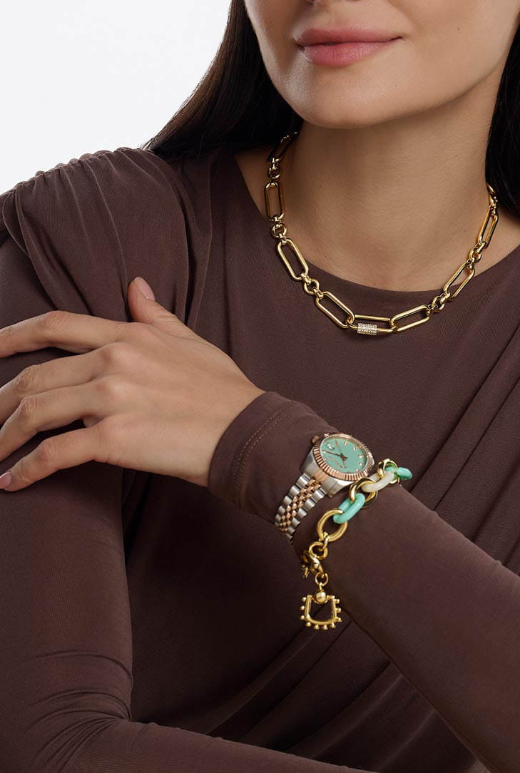 Женские кварцевые часы Mathey-Tissot Mathy D810RV — это стильное сочетание элегантности и современного дизайна. Изящный корпус выполнен из нержавеющей стали, диаметром 32 мм, что придаст образу женственности и романтизма. Изысканный циферблат с метками в виде точек украшены кристаллами, что придает модели особый блеск. Циферблат защищен минеральным стекломМинеральное стеклоМинеральное стекло представляет собой искусственно выращенный минерал кварца. Такое стекло отличается особой устойчивостью к повреждениям и царапинам. Уступает по некоторым качествам сапфировому стеклу., обеспечивающий устойчивость к царапинам. Стрелки с люминесцентным покрытиемЛюминесцентное покрытиеПозволяет считывать показания времени в темноте. Производители наносят на стрелки, часовые индексы, безель или поверхность циферблата светонакопительный состав, дающий холодное свечение.. БезельБезельВнешний ободок, закрепляющий стекло. В спортивных часах так называется поворотное кольцо с делениями на циферблате, выполняет роль таймера – замеряет отрезки времени на шкале. Неподвижный безель – элемент декора. Однонаправленно вращающийся безель на дайверских часах позволяет фиксировать моменты погружения и выныривания на поверхность. с PVD-покрытиемPVDУльтратонкое покрытие наносится в технике вакуумного напыления, сочетает в себе нитрид титана особой прочности со слоем золота или оксида хрома. Несёт в себе декоративную или защитную функцию. золотистого цвета. Окошко даты находится в положении 3 часа. Часы оснащены надежным кварцевым механизмом. Стальной браслет с частичным PVD-покрытиемPVDУльтратонкое покрытие наносится в технике вакуумного напыления, сочетает в себе нитрид титана особой прочности со слоем золота или оксида хрома. Несёт в себе декоративную или защитную функцию. на раскладной застёжке с фиксаторомРаскладная застёжкаТакой тип застёжки используется только на браслетах из металла. Она никогда не раскрывается полностью, происходит разделение на 2 и более частей. Раскладывающая застёжка снизит вероятность потери часов к минимуму., гарантирует комфортное и безопасное ношение. Класс водозащиты: 50 метров позволит защитить корпус от случайных брызг или капель дождя. Mathey-Tissot  — отличный выбор для тех, кто ценит утонченность и качество.